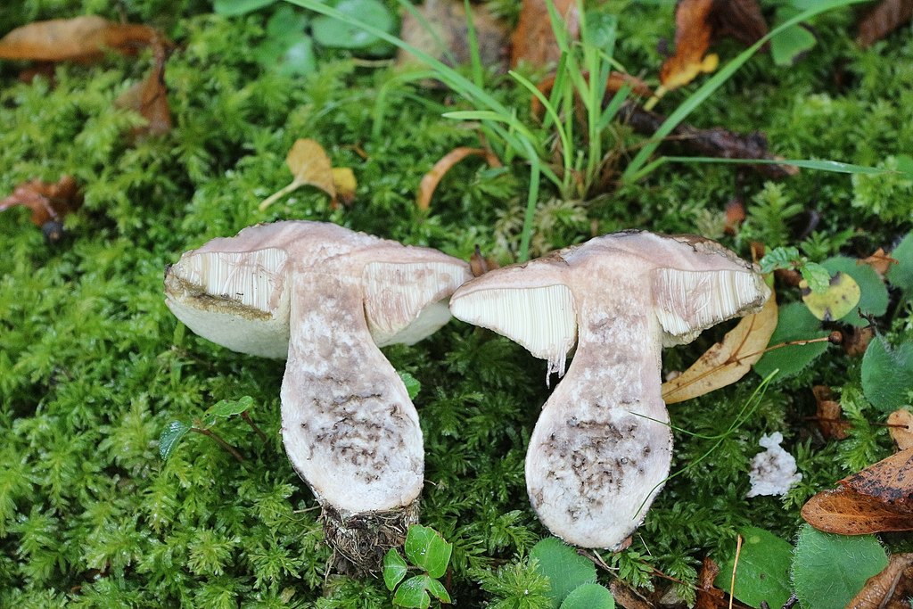 2) Russula graveolens (Weinroter Heringstäubling), die dunkle Stelle am Stiel wurde mit Eisensulfat behandelt; wie man sieht, ist das mehr als nur schmutzig graugrün