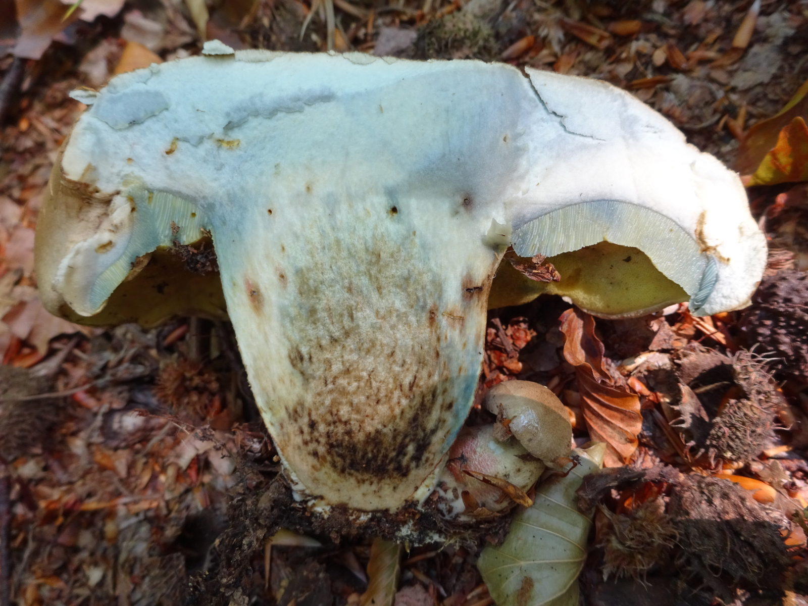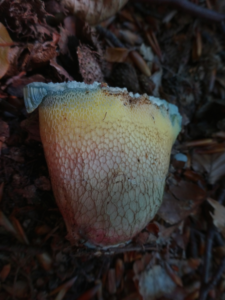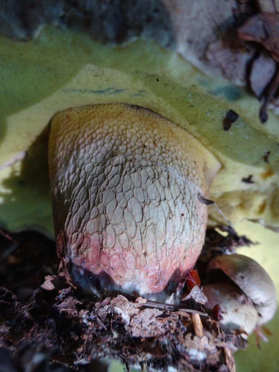 wie im Betreff schon geschrieben vermute ich hier den Schönfuß-Röhrling, die drei haben wohl einen trockenschaden, die Huthaut war in feinen Schollen aufgerissen.