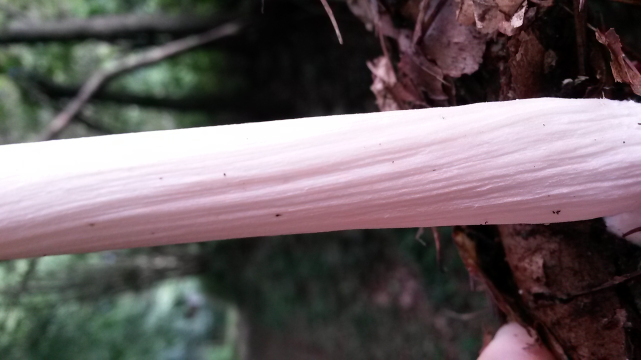 Schirm 8-10 cm, Stiel ca. 15 cm. Der Stiel war zudem auffällig verdreht und gerieft. Er wuchs an einem toten Ast am Boden.
