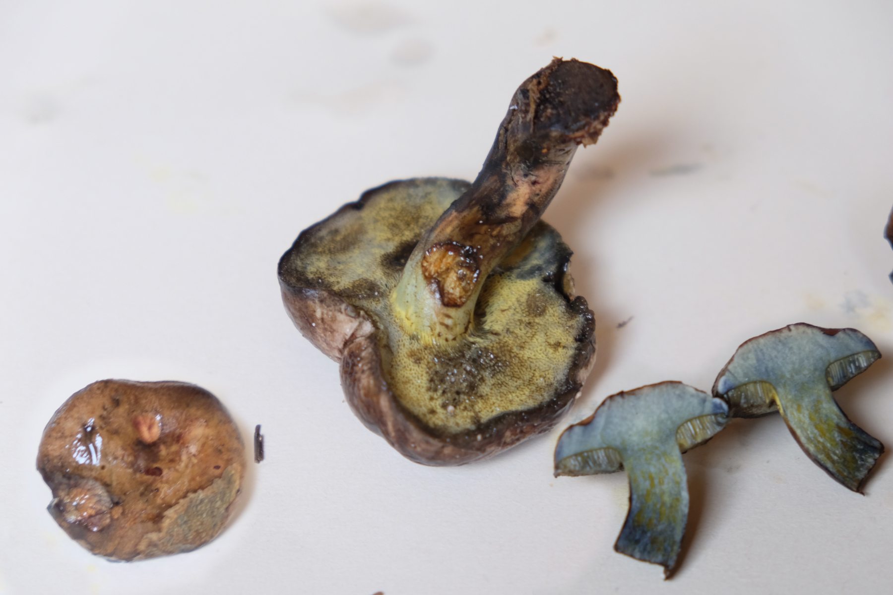 Beim ersten Exemplar gehe ich von einem Schwarzblauenden Röhrling aus, da sich Schnitt und Druckstellen sehr stark blau und später schwarz verfärben. Der Stiel ist in Bodennähe bräunlich, Verläuft nach Oben ins gelbliche. Hier bin ich mir nicht Sicher ob es sich nicht eventuell um den Netzstieligen Bitterröhrling handelt, jedoch hat eine kleine Geschmacksprobe nicht bitter geschmeckt. Ich habe aber mal gelesen das nicht alle Menschen den bitteren Geschmack wahrnehmen können. Eigentlich wäre es dann ja relativ egal wenn ich mir das Pilzgericht geschmacklich nicht versauen kann, jedoch habe ich hier im Forum gelesen das der Bitterröhrling leicht giftig ist. Daher meine Frage ob meine Bestimmung richtig ist und wie man den Schwarzblauenden Röhrling vom Bitterröhrling unterscheiden kann.