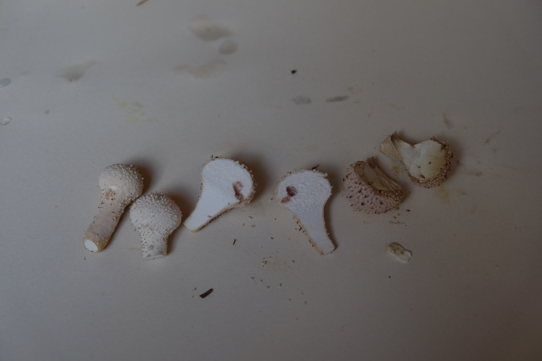 Zu guter letzt hätte ich noch Flaschenstäublinge gefunden, wo ich die jungen Fruchtkörper mitgenommen habe. Durch einen Querschnitt habe ich überprüft ob das innere noch weiß ist bzw. ob es sich nicht doch eventuell um einen jungen knollenblätterpilz handelt. Ebenfalls hier erster Versuch meine Artenkenntnis essbarer Pilze zu erweitern weshalb ich die Erstbestimmung überprüfen möchte ![]()
