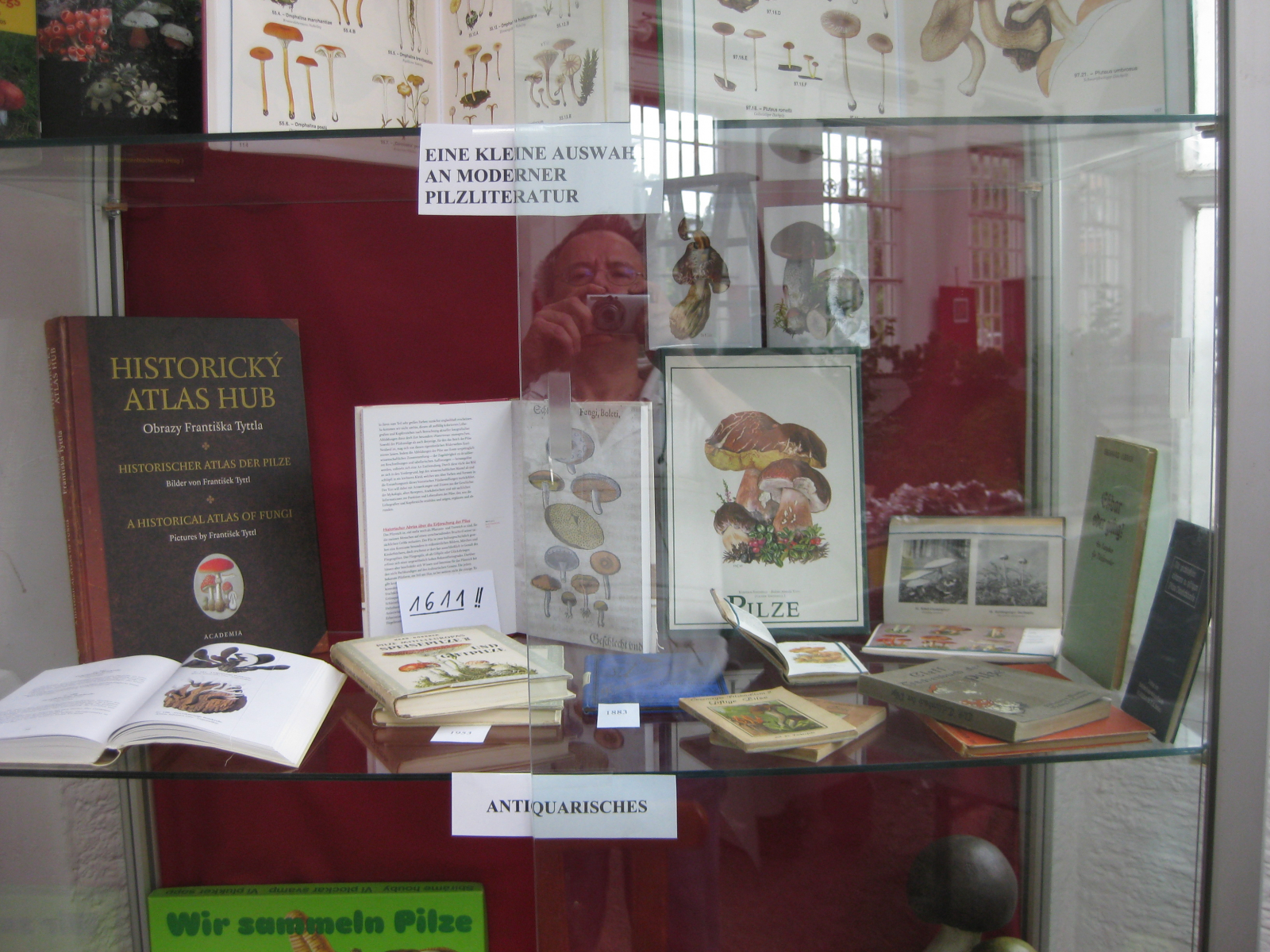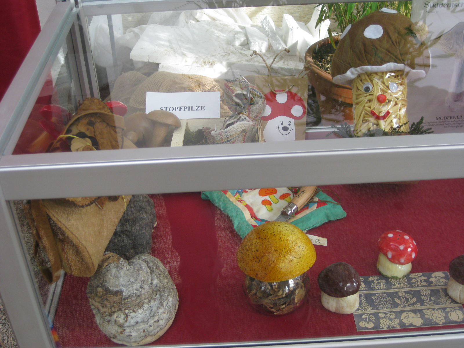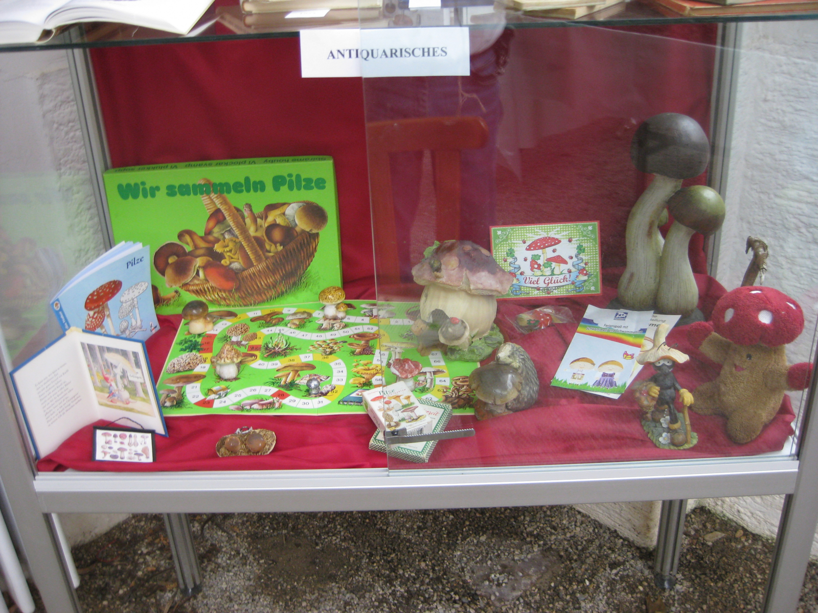 Ich bin unter anderem vor allem zuständig für die Ausstellung der Pilzliteratur, der Exponate, wie seit Jahrtausenden mit Hilfe von Zunderschwämmen Feuer gemacht wird, Kleidungsstücke hergestellt werden, welche Heilpilze es gibt usw. Viel Spaß macht auch das Herrichten von Vitrinen mit Pilzsachen die vor allem für Kinder geeignet sind wie Pilzspiele, Kartenspiele mit Pilzen, Bücher et cetera. Ich füge hier ein paar Bilder davon bei. Die Bildqualität ist nicht so gut, da die Scheiben der Vitrinen natürlich stark spiegeln.