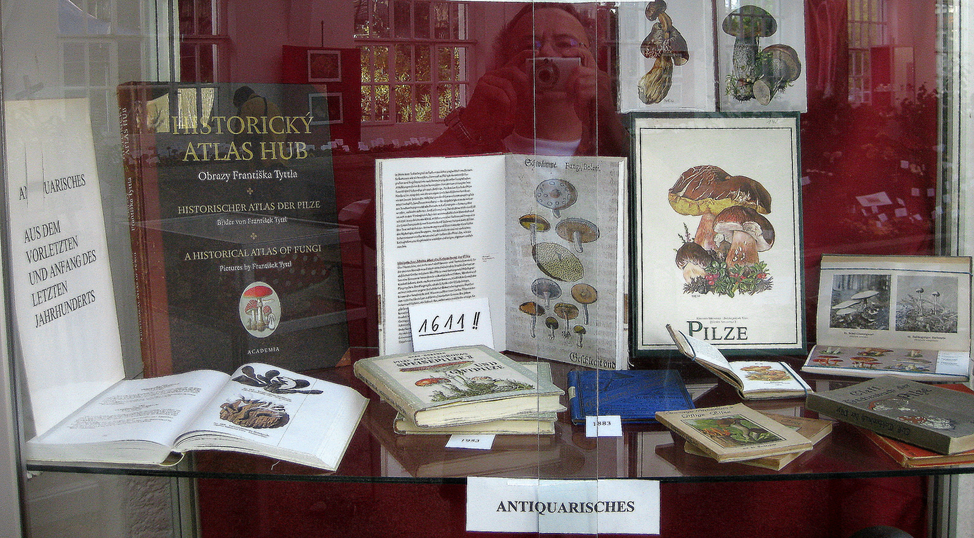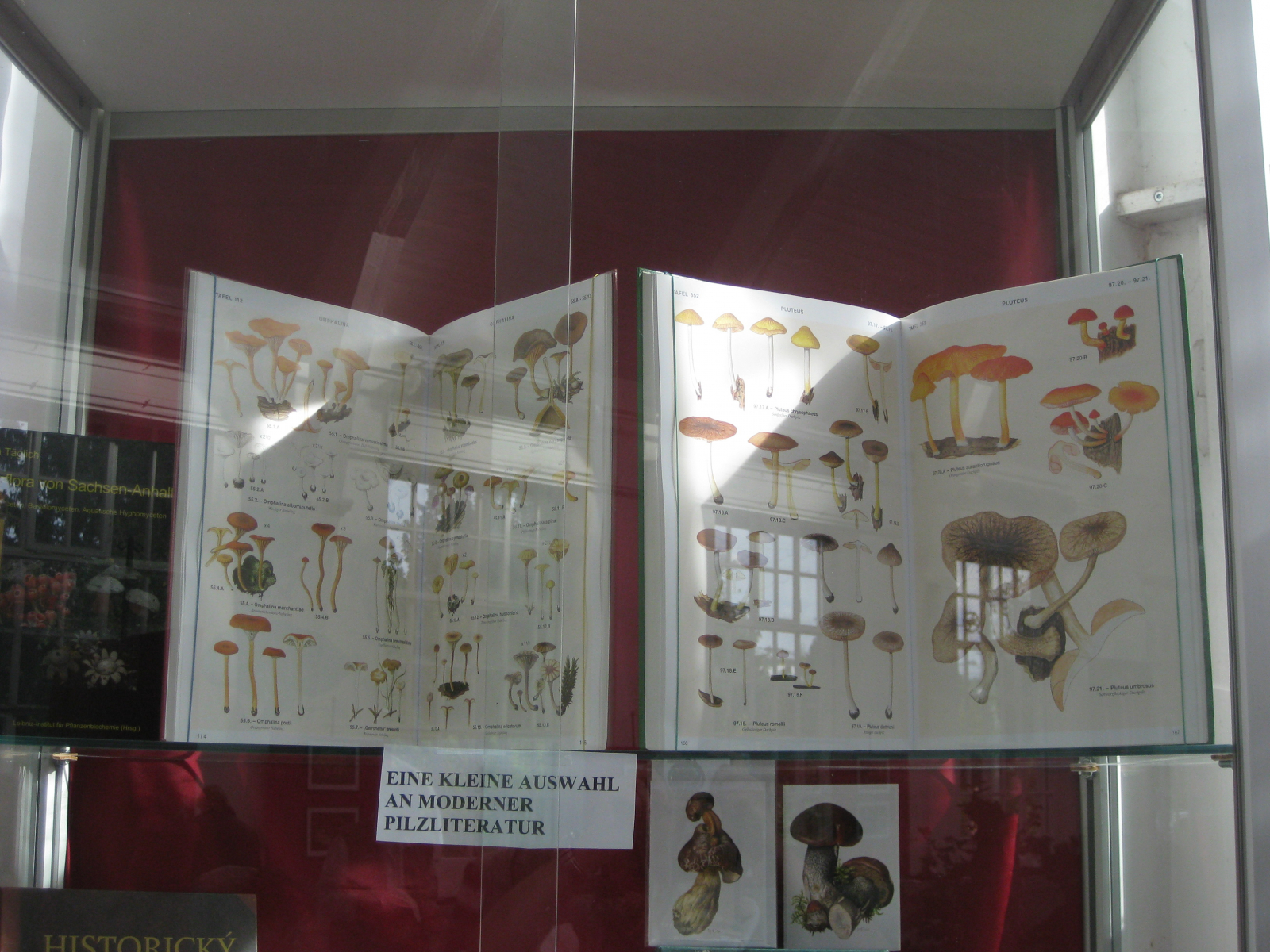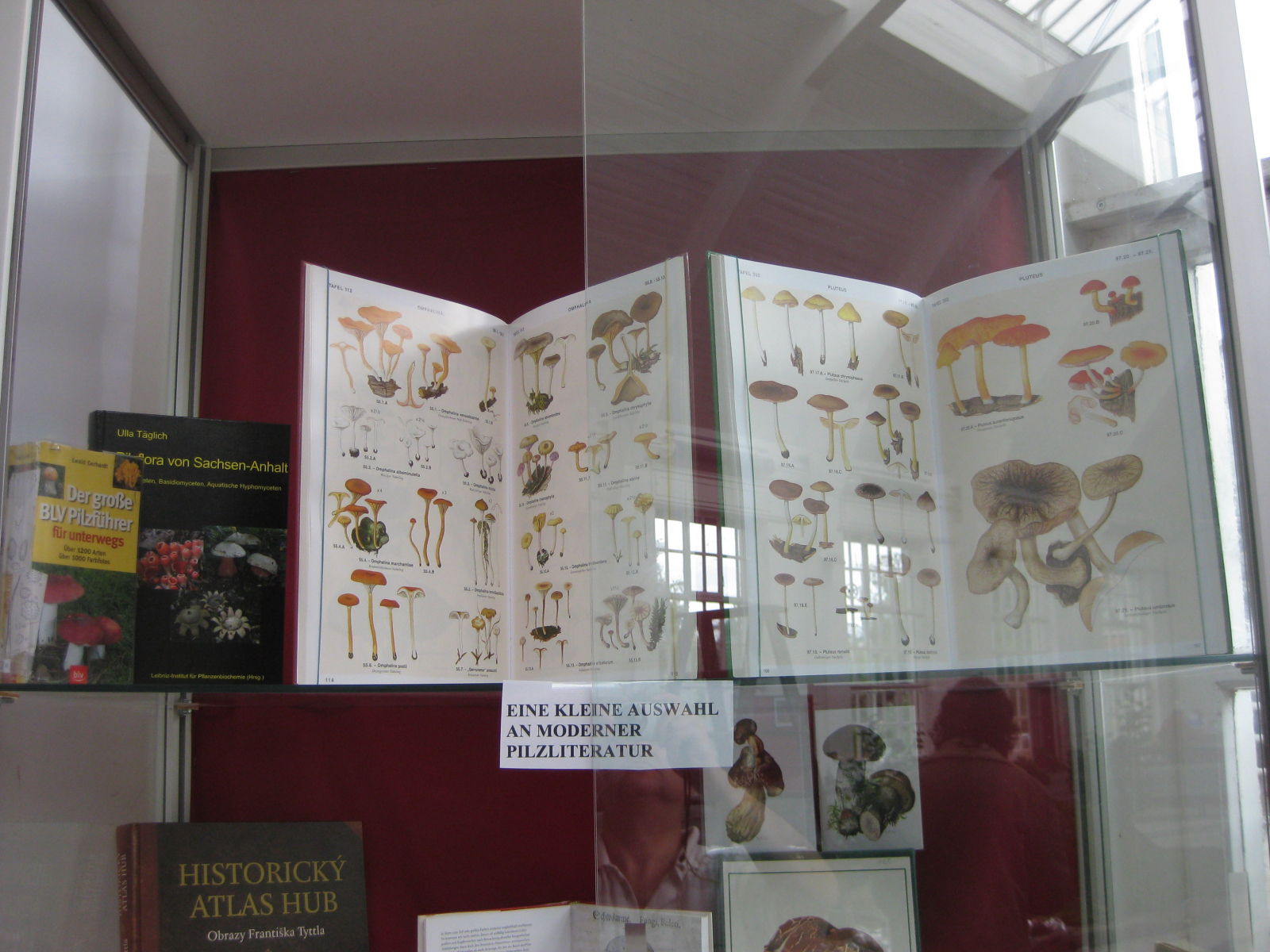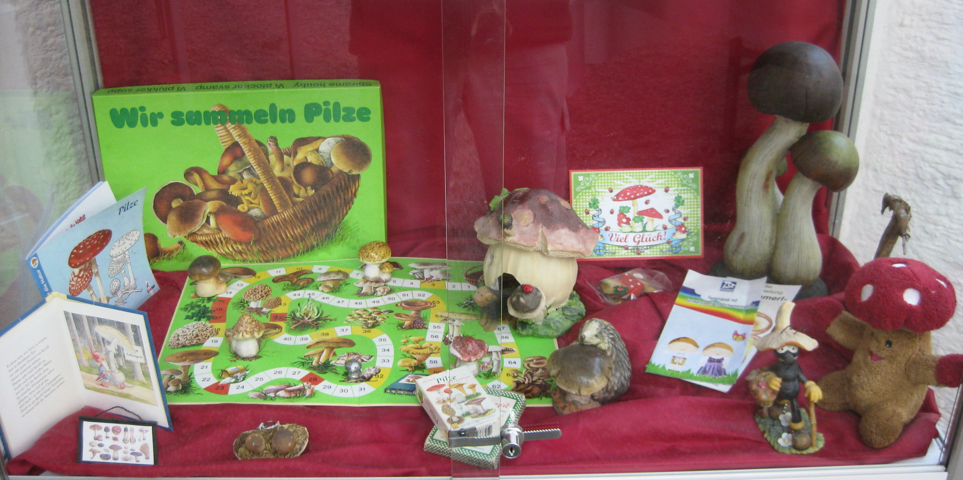 Ich bin unter anderem vor allem zuständig für die Ausstellung der Pilzliteratur, der Exponate, wie seit Jahrtausenden mit Hilfe von Zunderschwämmen Feuer gemacht wird, Kleidungsstücke hergestellt werden, welche Heilpilze es gibt usw. Viel Spaß macht auch das Herrichten von Vitrinen mit Pilzsachen die vor allem für Kinder geeignet sind wie Pilzspiele, Kartenspiele mit Pilzen, Bücher et cetera. Ich füge hier ein paar Bilder davon bei. Die Bildqualität ist nicht so gut, da die Scheiben der Vitrinen natürlich stark spiegeln.