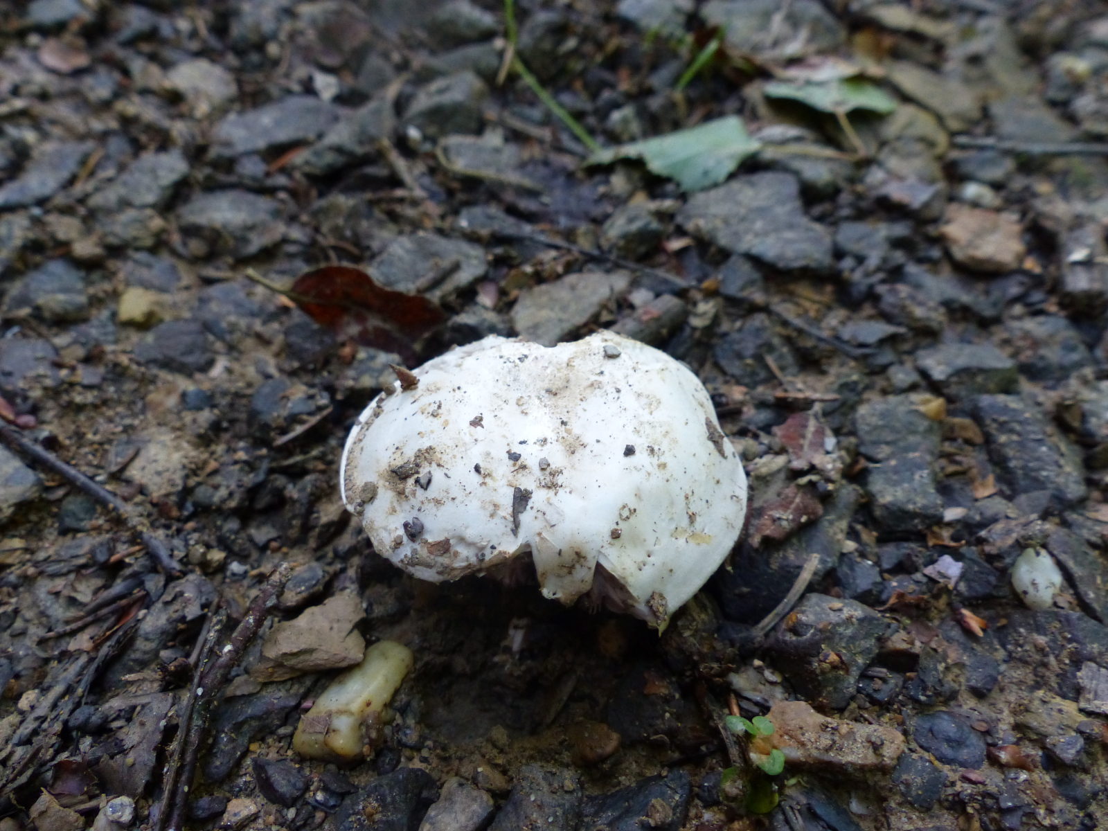 Hut: weiß, etwa 4-5 cm Durchmesser, leicht gewölbt. Huthaut stülpt sich etwa 0,02 cm über die Lamellen drüber. Der Hutrand hing auf der linken