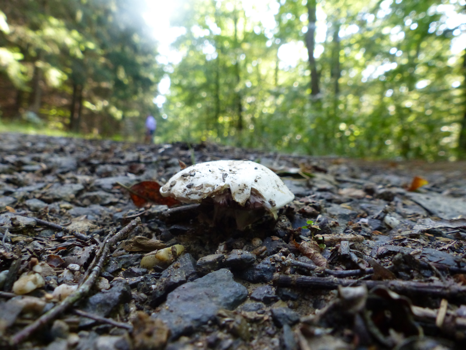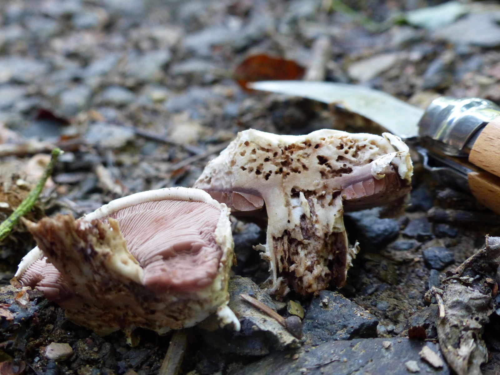 Stiel: sehr kurz, keine Stielbasis mehr vorhanden, da Madenbefall und alles brüchig zerfressen. Die Festigkeit des Weges kam noch dazu.