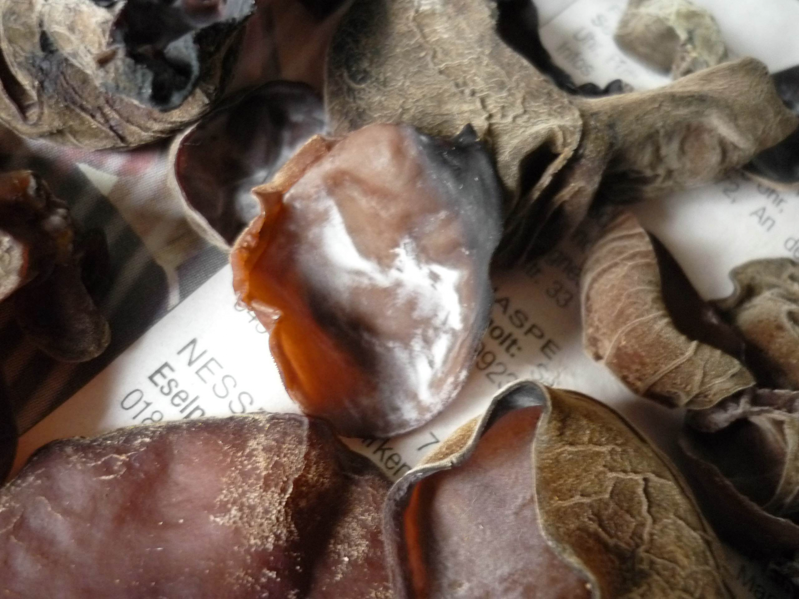 habe mich vor ein paar Tagen hier im Forum angemeldet und mir als Pilzneuling schon eifrig nach Informationen zu Winterpilzen durchgeguckt. Da bin ich auch auf die Judasohren gestoßen und von denen habe ich jetzt ein paar gesammelt. Ich habe sie zum Trocknen auf einer Zeitung ausgelegt, aber bei vielen sehe ich eine Art weißen Belag, könnte das Schimmel sein? Man kann den Belag mit dem Finger wegwischen. Grünlich aussehende habe ich schon aussortiert.