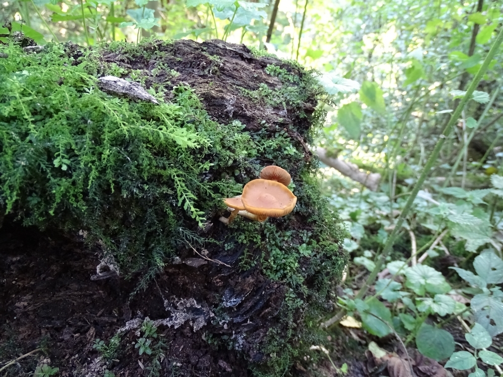 morscher, vollständig bemooster Baumstamm (nicht mehr erkennbarer Art) in einem Laubwald mit Auwald-Charakter. Direkt neben einem Teich (ehemalige Lehmgrube)