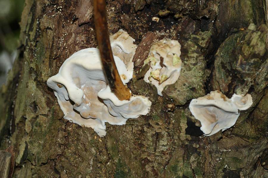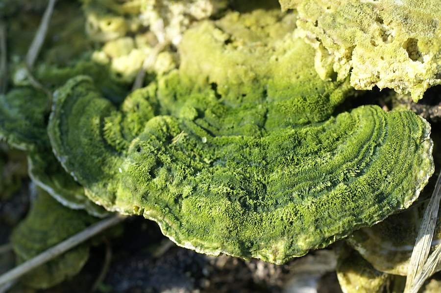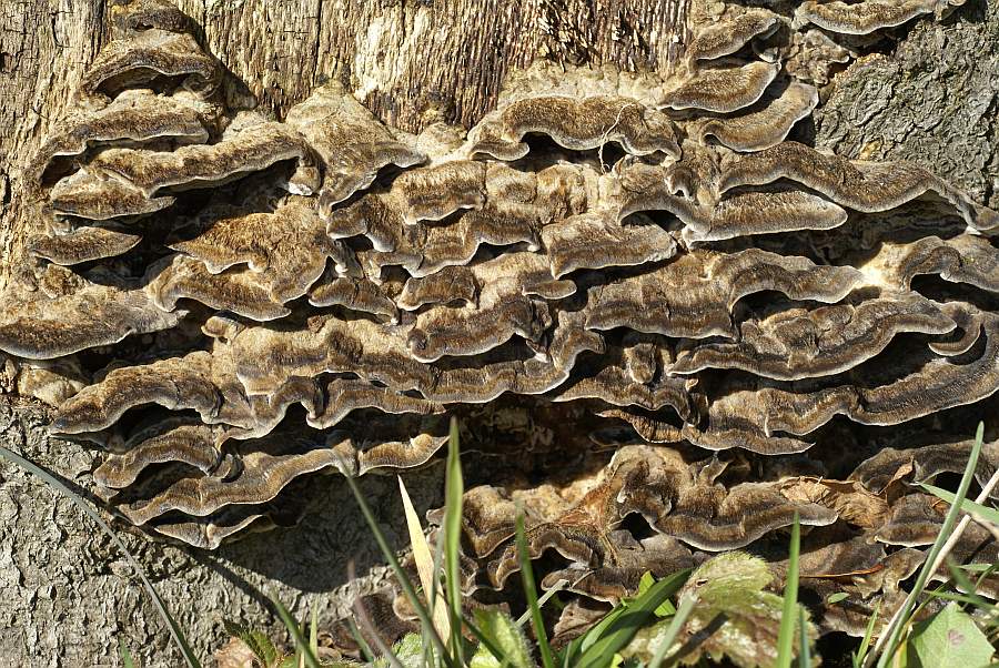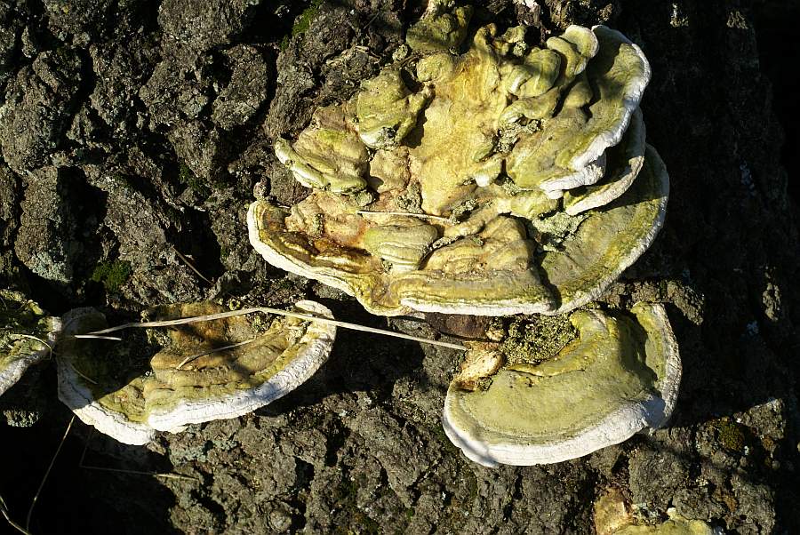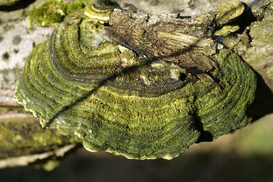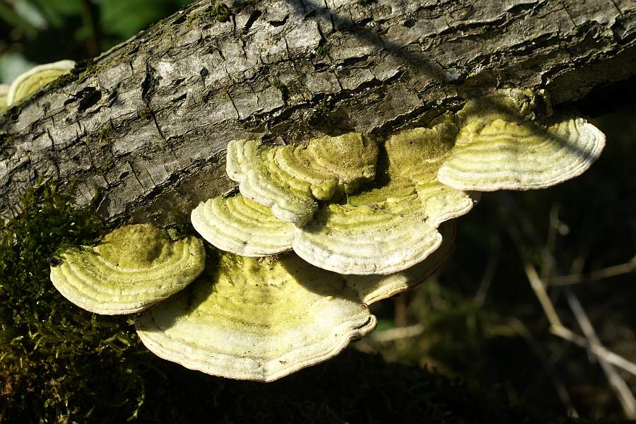 die nachfolgenden Pilze könnten nach LAUX Buckeltrameten sein: der helle Hut ist buckelig-knotig am Baum angewachsen, mit samtiger, trockener Oberfläche, konzentrisch gezont und am Rand scharfkantig. Die Zuwachszonen sind heller, die älteren mit grünen Algen bewachsen. Sie wuchsen mehr tellerförmig nebeneinander, aber auch übereinander geschichtet und sich dabei teils überlappend.