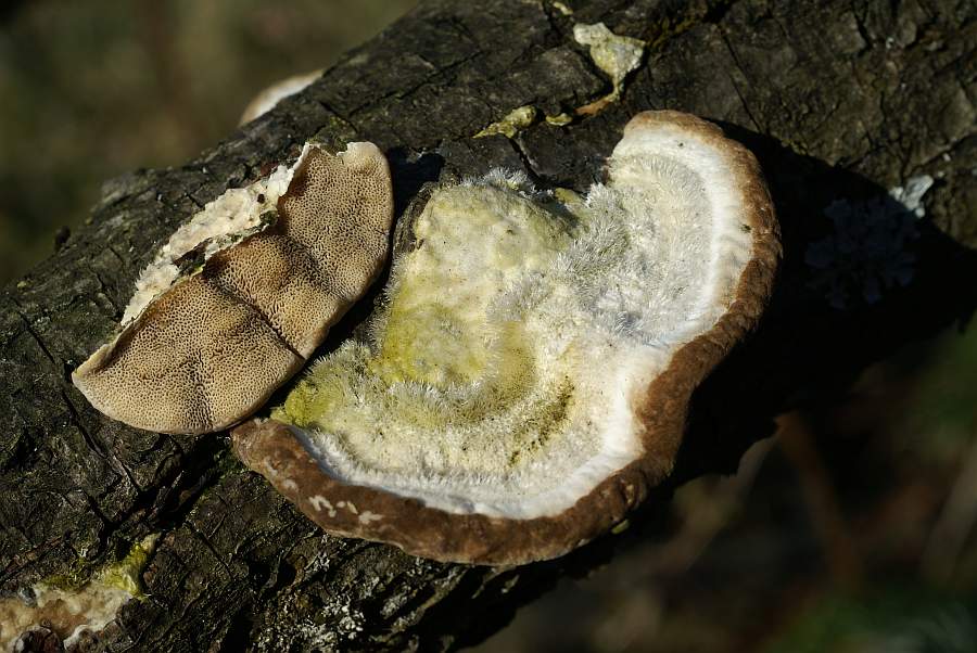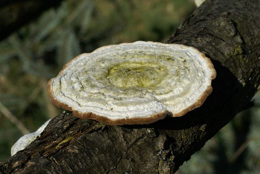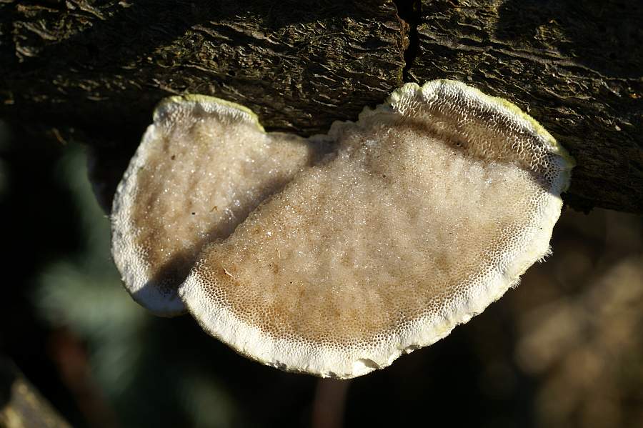 Die nächste Art wuchs in der ehemaligen Baumschule an sonnenexponierter Stelle. Die meisten Fruchtkörper wuchsen dachziegelartig übereinander, nur einer tellerrund auf der Astoberfläche. Die Hutoberfläche ist gezont und fein-borstig "handschmeichlerisch" behaart, der Rand ist dick und deutlich samtig-braun abgesetzt. Die Porenausgänge auf der Unterseite sind rund und mehr zum Rand hin länglich. Die Farbe der Unterseite ist schmutzig grau-bräunlich und bei einem Exemplar am Rand deutlich weiß gezont.