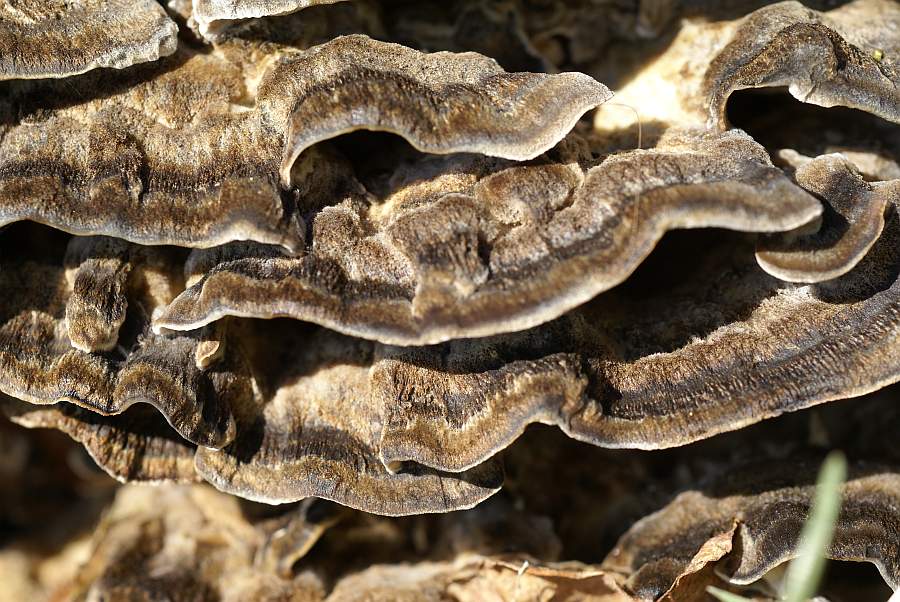 Die letzte Art scheint auch ein Allerwelts-Massenpilz zu sein. Ich fand ihn an vielen der Eichenstümpfe. Und komme ihm doch nicht näher. Die Fruchtkörper waren trocken, samtig, max. 4 - 5 cm aus dem Holz herauswachsend, von innen hell nach außen dunkler gezont, in sehr engen Schichten übereinander wachsend. Zuwachskante und Unterseite hell. Kante "scharfschneidig".