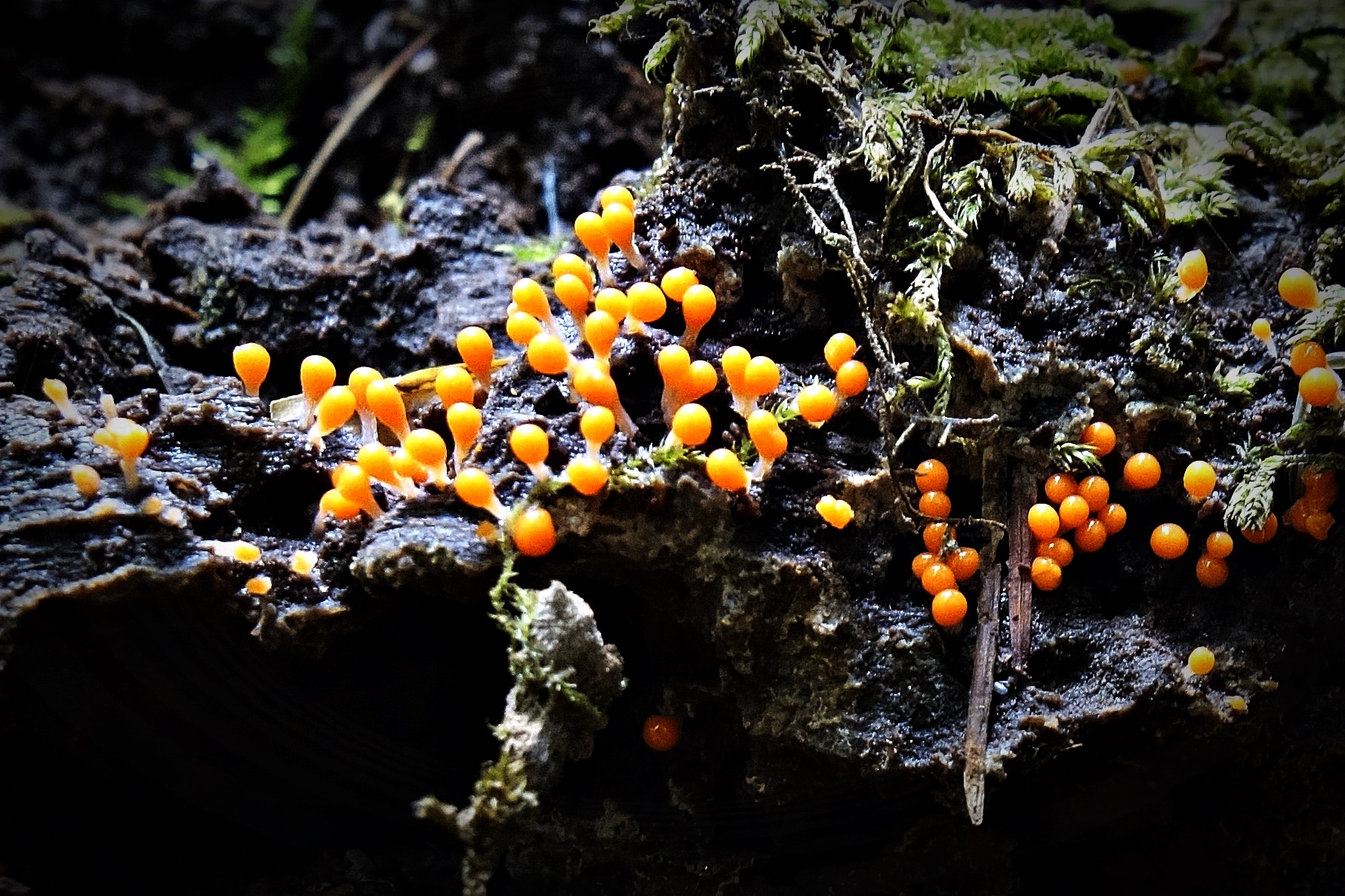 10. direkt neben dem Rotköpfigen - Trichia Decipiens, den man in dieser leuchtenden Farbe nur für kurze Zeit findet und sonst leicht übersieht, wuchs ein weiterer, noch kleinerer, grauer Schleimpilz, ähnlich gestaltet, aber auch teilweise wurstförmig im Wuchs - vielleicht gehört er ja dazu?