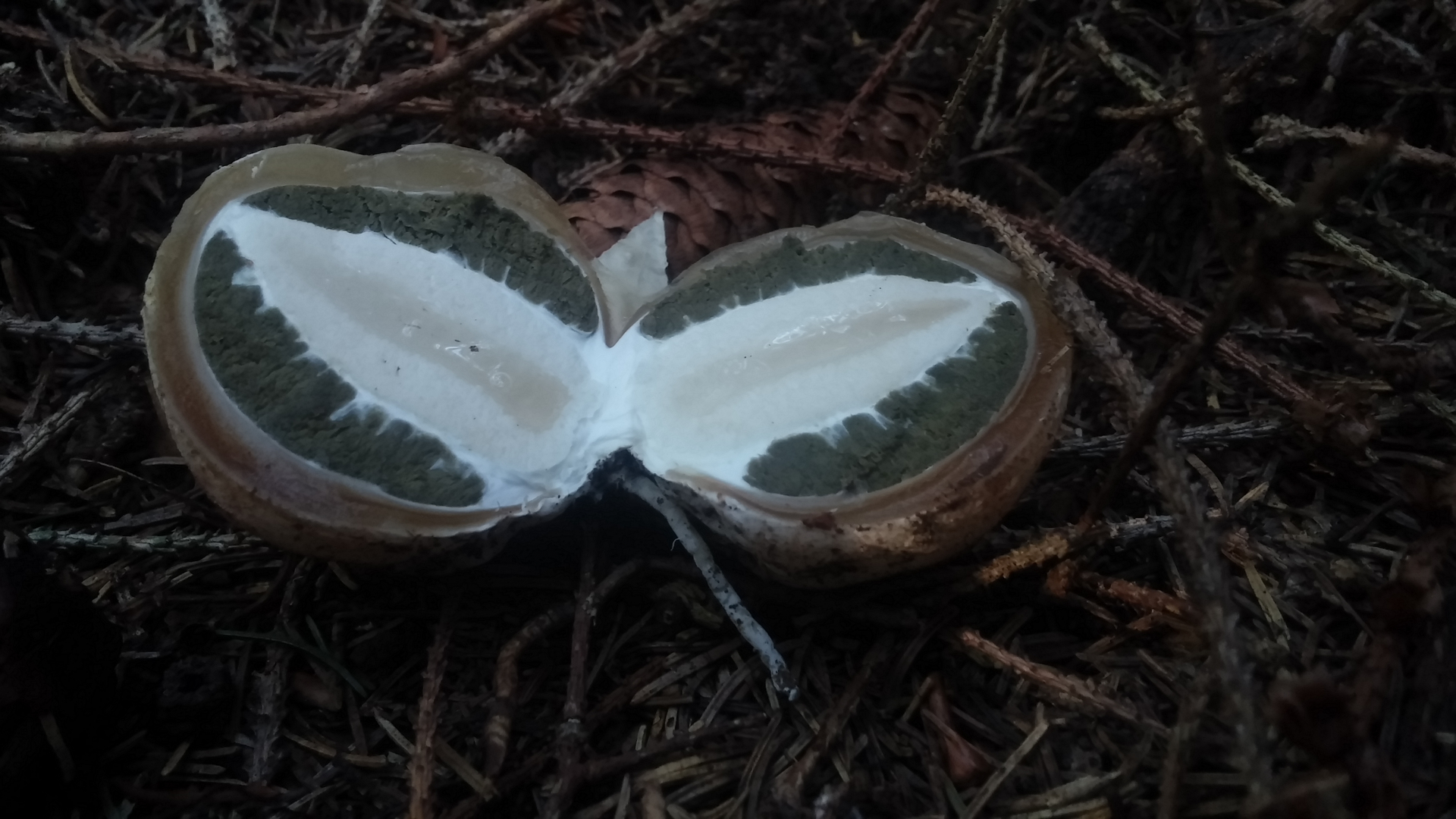 Eins hab ich zur Bestimmung aufgeschnitten. Ziemlich schnell kamen wir zur Stinkmorchel, die ich bisher nur einmal in einem viel späteren Zustand gesehen hatte.