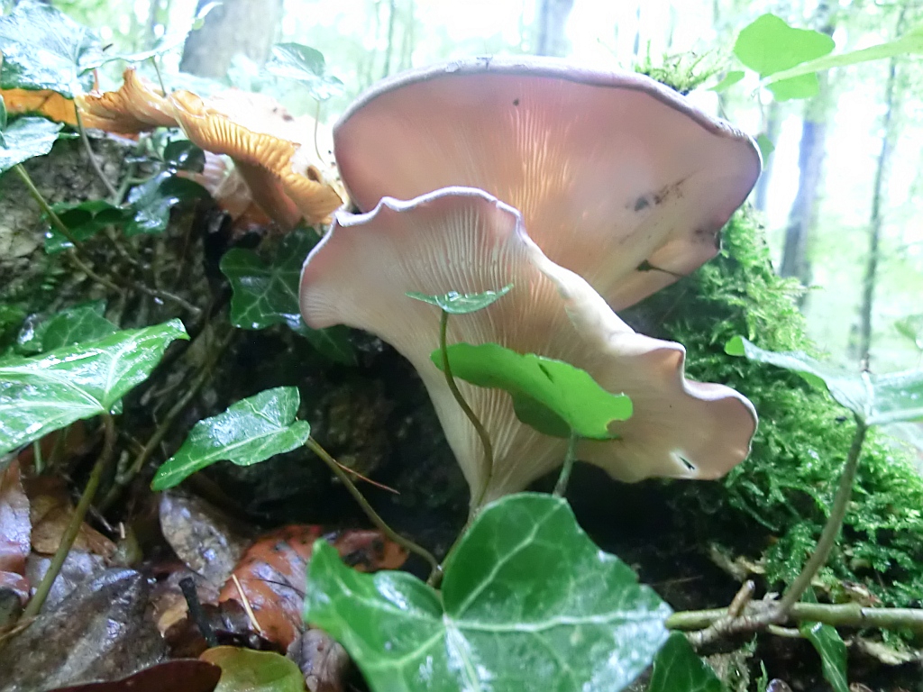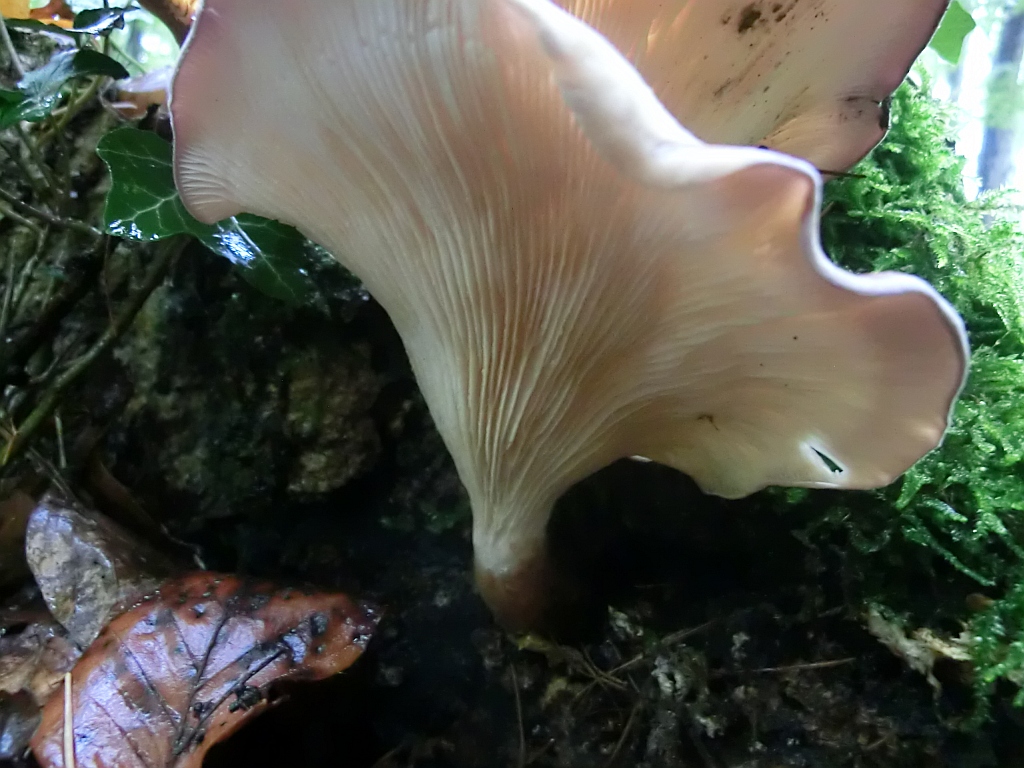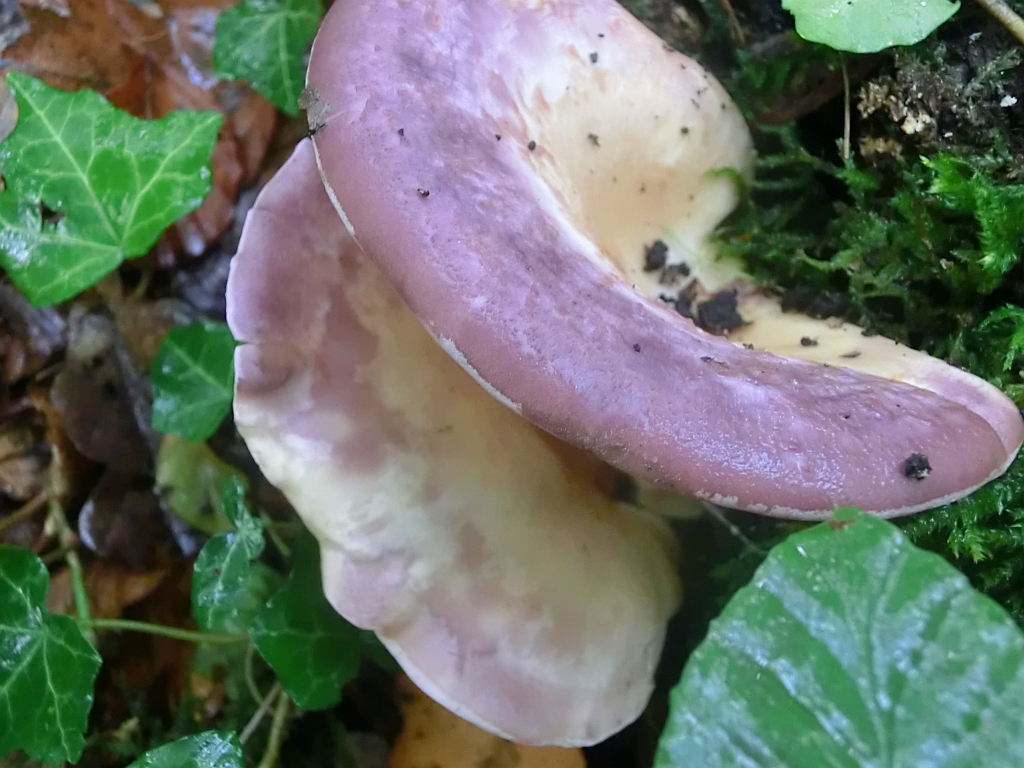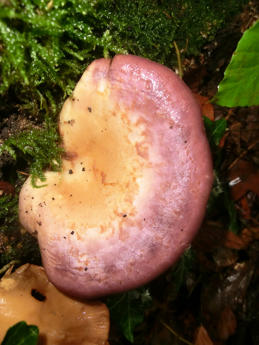 die violette Oberseite spricht für Panus conchatus, den Laubholzknäueling.