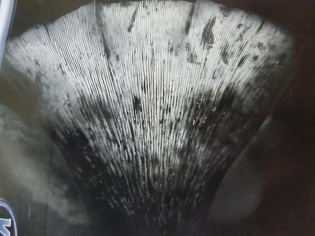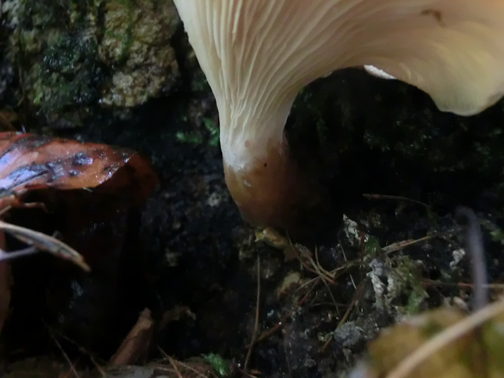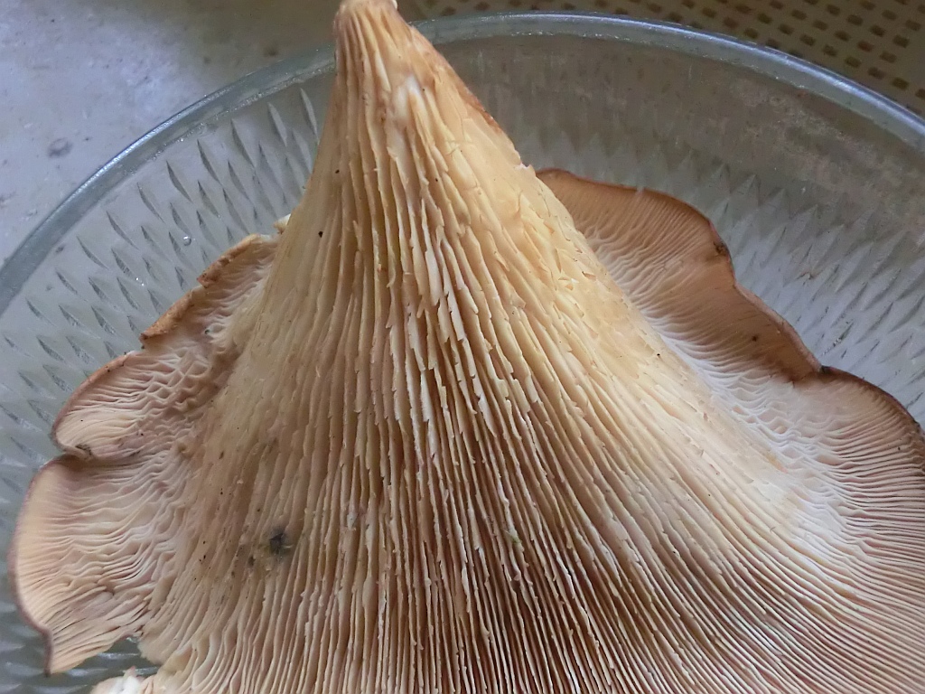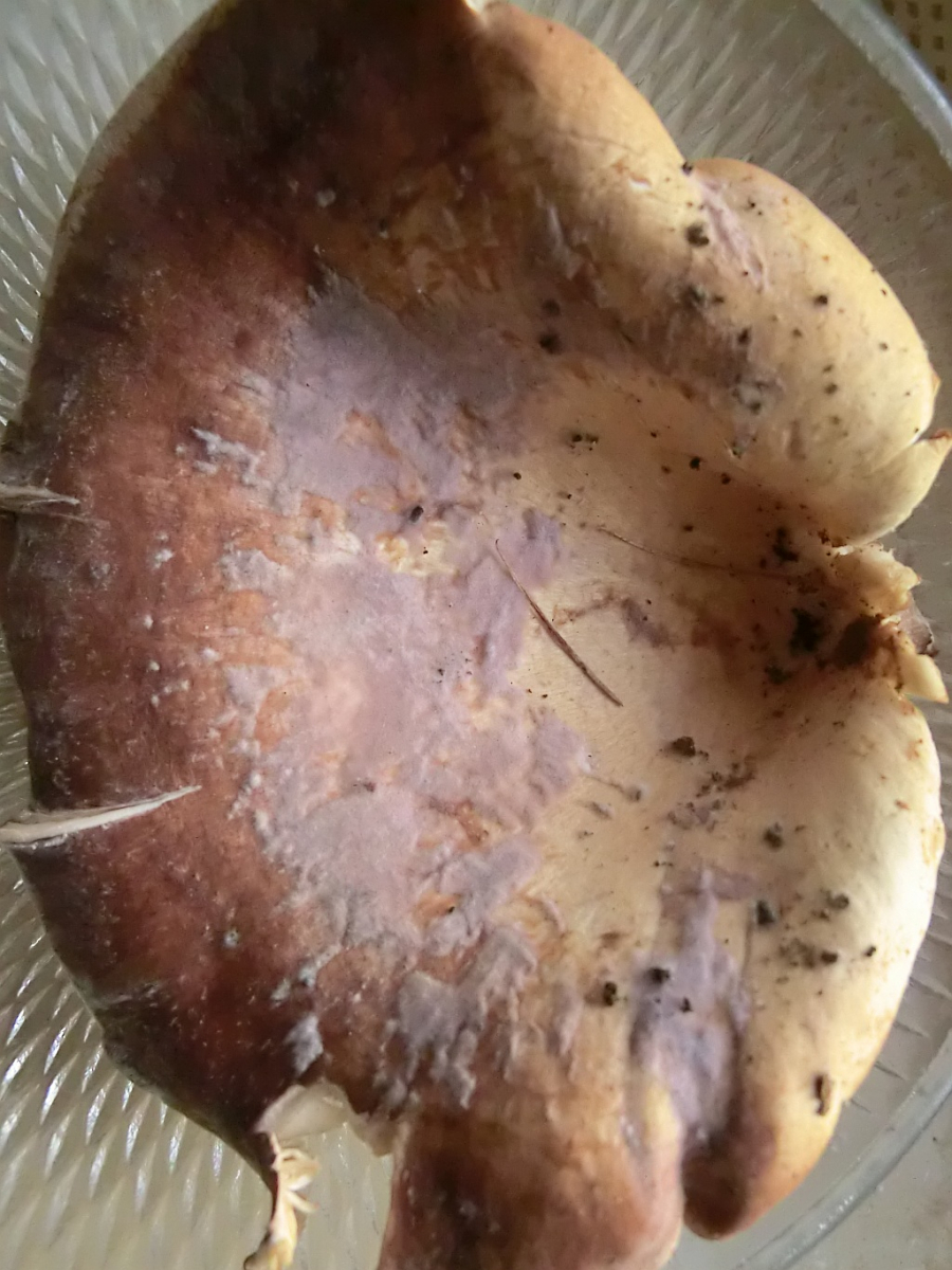 Also: Der Geruch ist lecker pilzig - er ist dünnfleischig und (noch) zart. Die Lamellen sind nicht mehr so weiß sondern nun creme-hellbraun. Auch ist die Hutoberseite nicht mehr ganz so Lila. Die Sporen sind weiß. Er hat nichts gelatinöses......