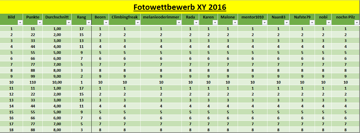 Die Jury-Arbeit beginnt am 20. eines jeden Monats. Zeitgleich mit den Bildern im jeweiligen Monats- oder Mottothread lade ich die Bilder anonymisiert in einen Abstimmungsthread im separaten, nur für die Jury zugänglichen Forenbereich. Dort haben die Jury-Mitglieder dann bis zum Monatsende Zeit, ihre Wertungen hineinzuschreiben, die ich dann in folgender Tabelle über Excel auswerte (Stand September 2016):