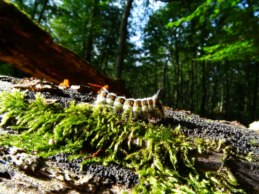 Wunderhübsche Raupe auf Bertia moriformis, Maulbeerkugelpilz