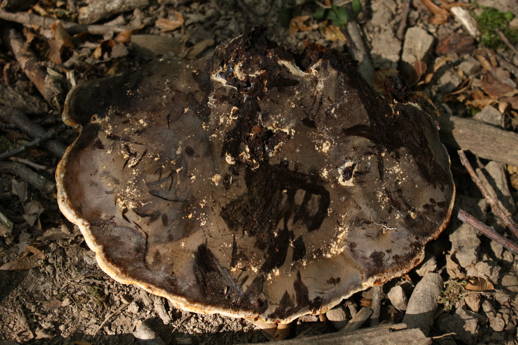 Dieser Pilz wuchs an einer vitalen Quercus petreia an der Stammbasis. Als er noch am Baum war, wirkten seine Poren hellgrau und er glich einer zu hell geratenen Ganoderma. Am Boden liegend waren die Poren fast schwarz, sie haben auch auf Druck geschwärzt.
