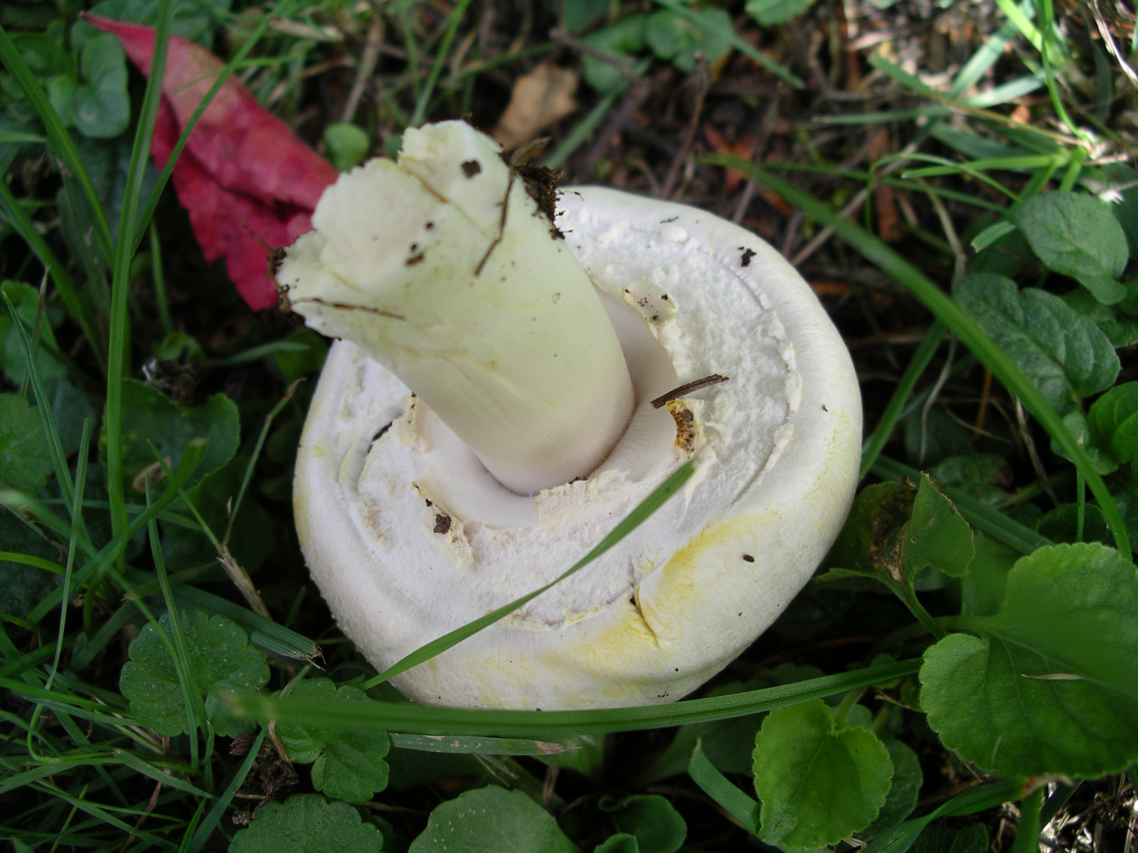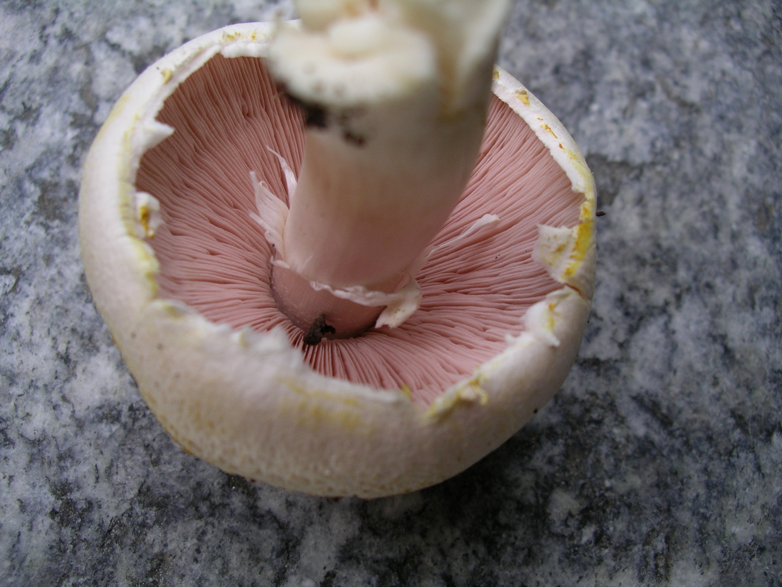 In diesem Fall kann man ganz sicher vom Giftchampignon ausgehen. Manchmal gilbt er sehr schwach, dann muß man die Stielbasis "ankratzen". Manchmal gilbt er überall und sofort, wie hier! Der Pilz verbreitet sich übrigens rasant!