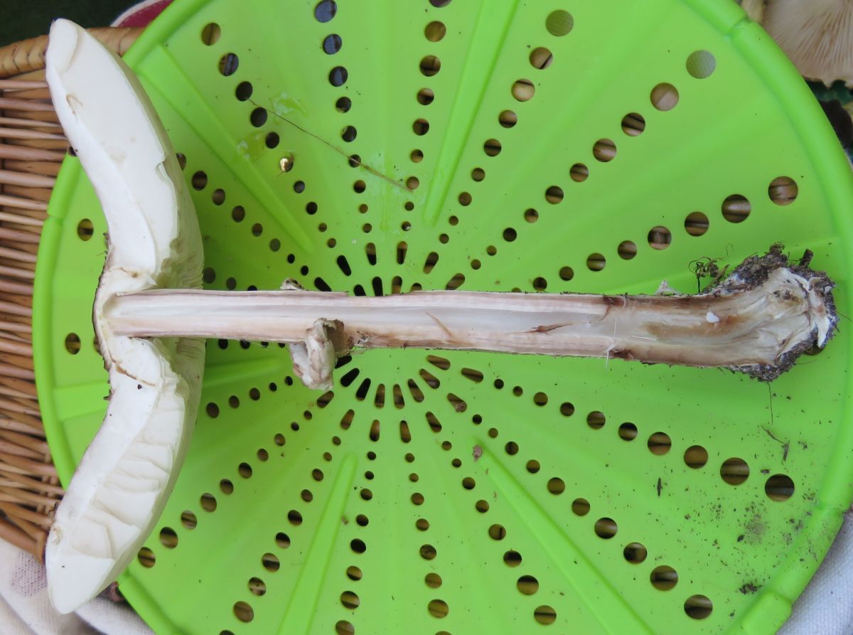 Fleisch: hell, bei Verletzung leicht bräunlich. Bei dem älteren Exemplar weinrot/braune Verfärbung an manchen Stellen.