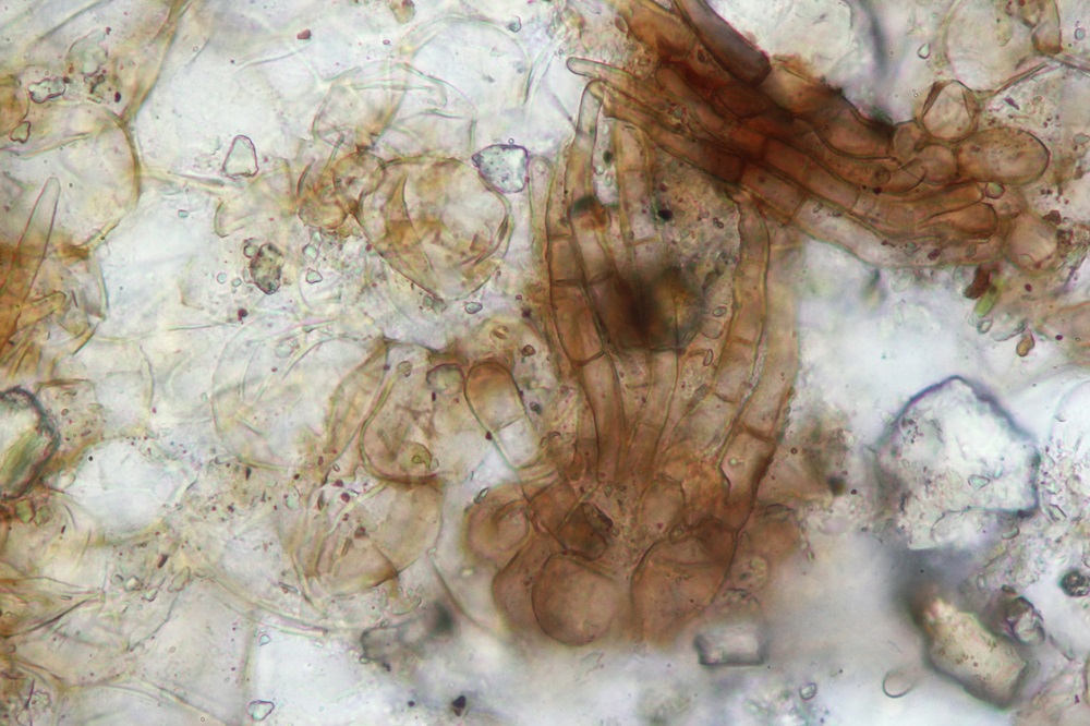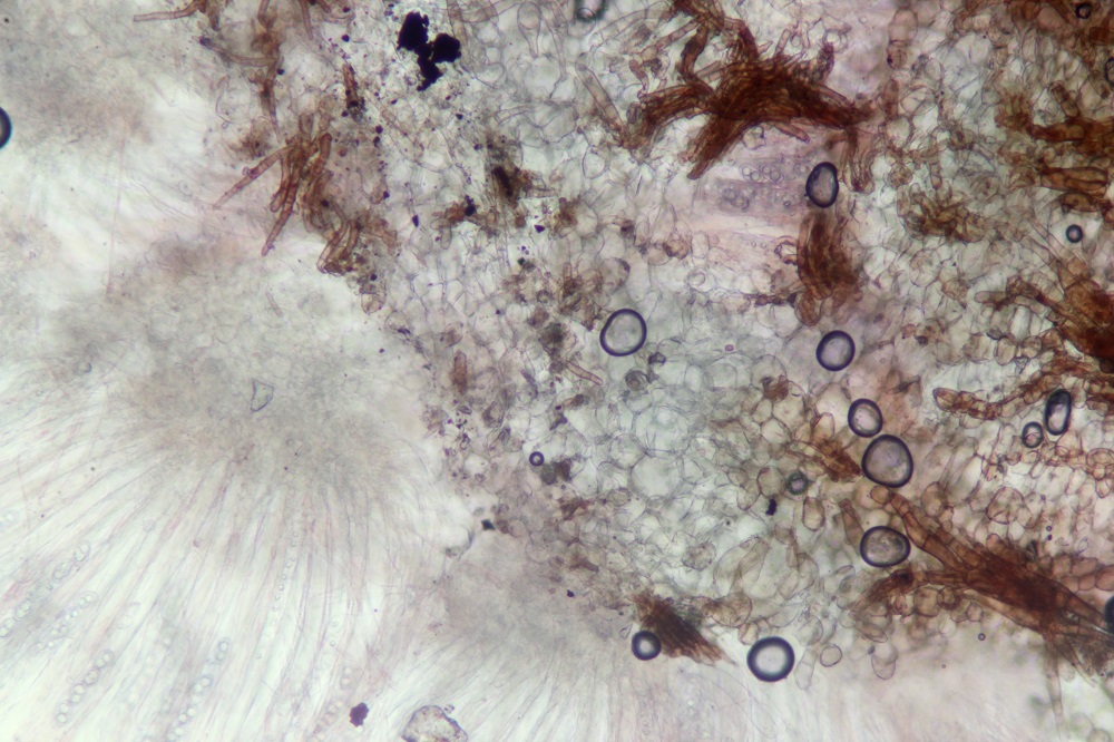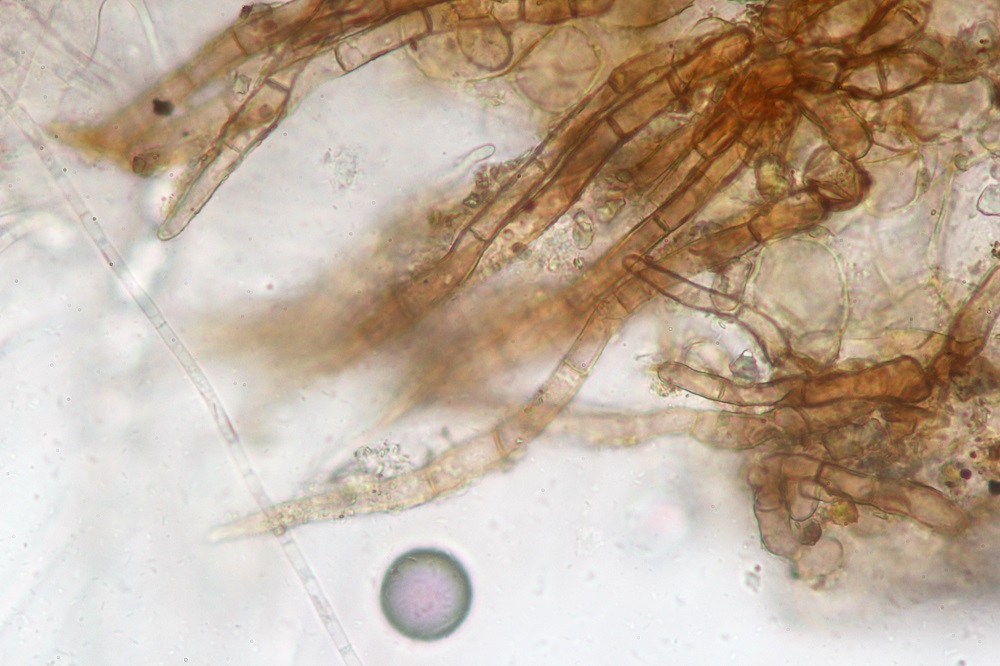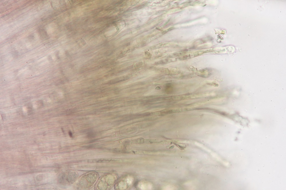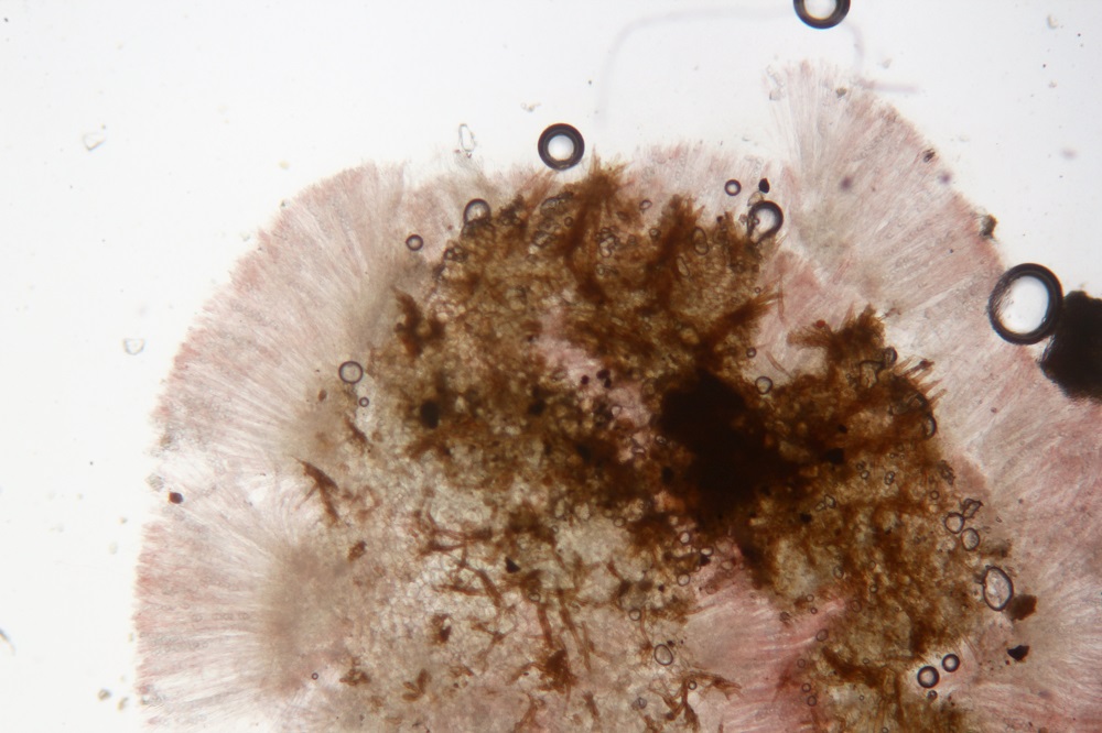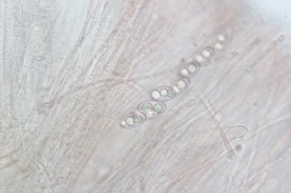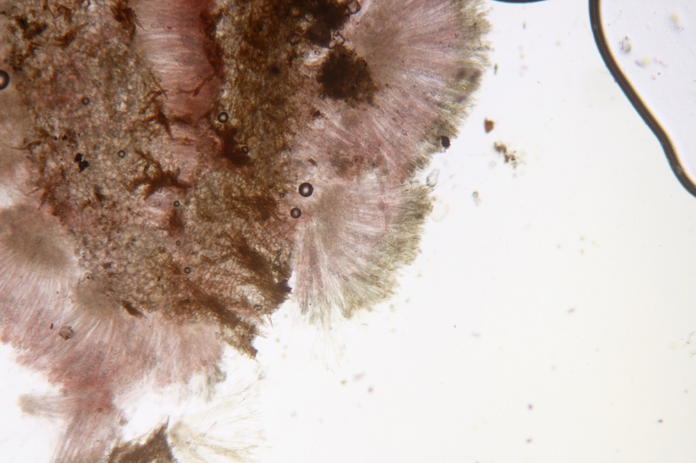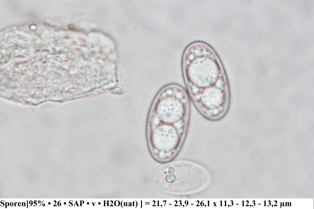 Das Hymenium ist pink und reagiert auf Lugol grün.