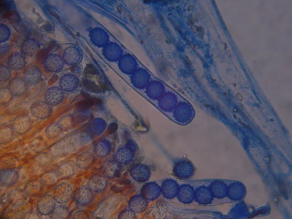 Als schönen Abschluss der Exkursion habe ich diese Scutellinia gefunden. Anhand er sehr markanten Sporen (Stacheln über 3 µm lang), habe ich die aber sehr schnell herausbekommen. Sie trägt den schönen Namen Scutellinia legaliae. Ich war wieder etwas versöhnt, denn die Sporen erinnerten mich schon etwas an [http://www.inocybe.org/unterga…3%B6ckersporer/calospora/]Inocybe calospora.[/url] ![]()