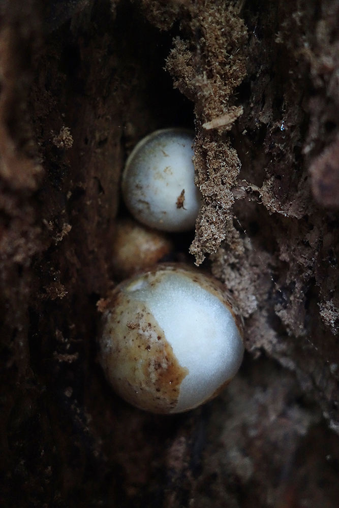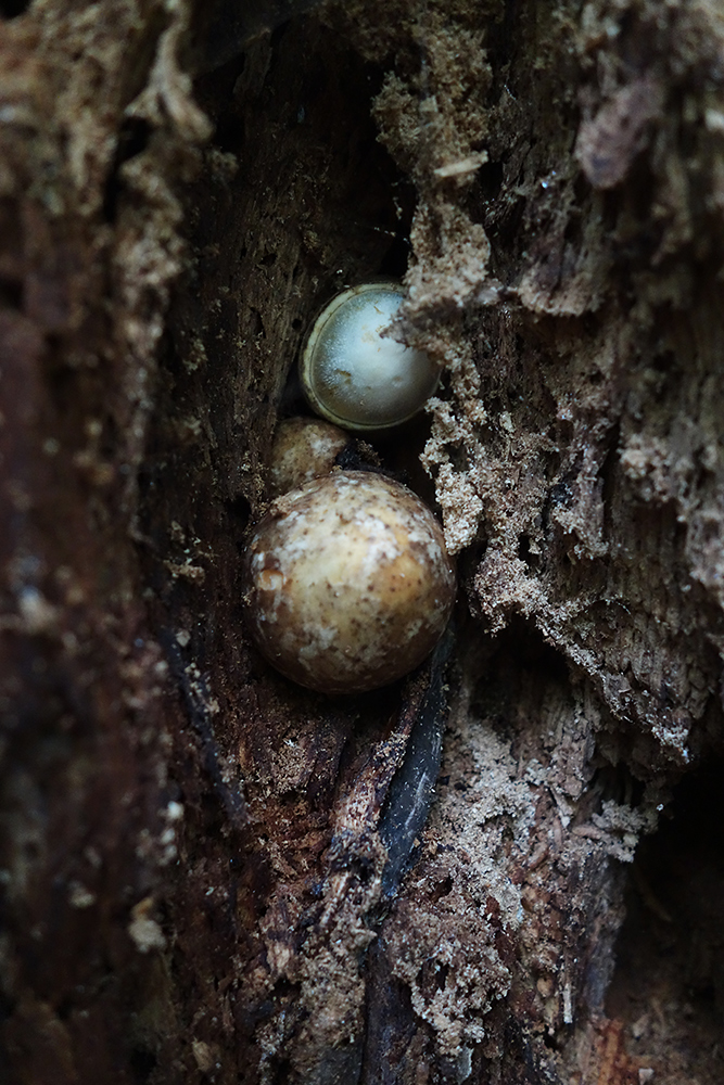 • Heute bin ich wieder - bei strömendem Regen - zum "Gelege" gelaufen. Und dann recht traurig dahergeschaut. Ein anderer neugieriger Waldbesucher hat das vorderste Ei gepflügt und aus dem Nest gemopst :( Einige Bäume entfernt war es (so schien es) sorgsam an den Fuß eines Baums gelehnt worden. Aber ab ist ab. :cursing: Wenigsten blieb mir so noch die Chance einige Bilder zu machen.