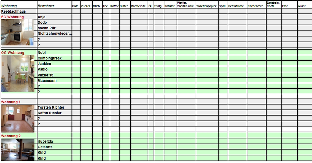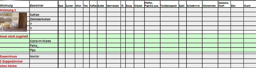 Damit nicht vieles doppelt mitgebracht wird an "Grundnahrungsmittel - und Sachen" habe ich die Teilnehmer in die Wohnungen aufgeteilt. So kann jeder entscheiden, was er für die "Wohnung" mitbringt. Da man ja die entsprechende Menge pro Wohnung mitbringt, reicht es für alle.