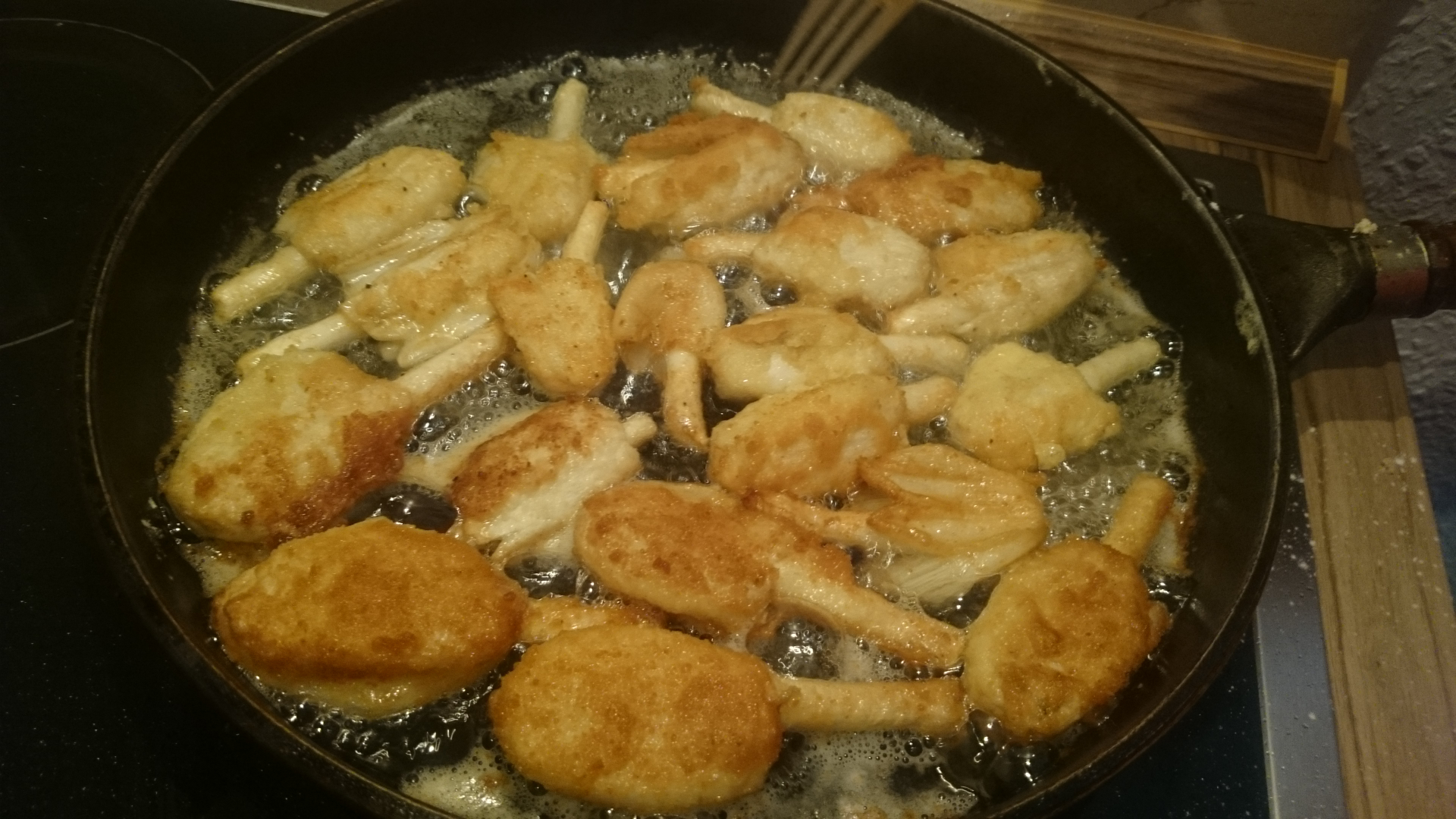 übergehen den Geschmack des Pilzes. Nur mit Mehl und Ei: