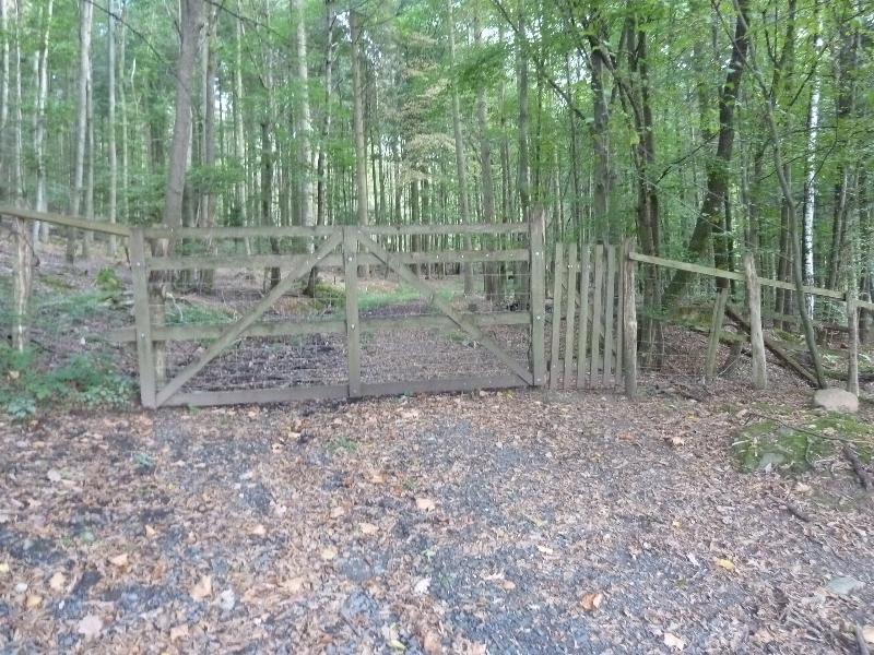 Erstmal durch das Tor in den Wald , der Büdinger Wald ist tatsächlich seit Jahrhunderten eingezäunt , war für den Fürst wahrscheinlich billiger als die Wildschäden zu bezahlen.