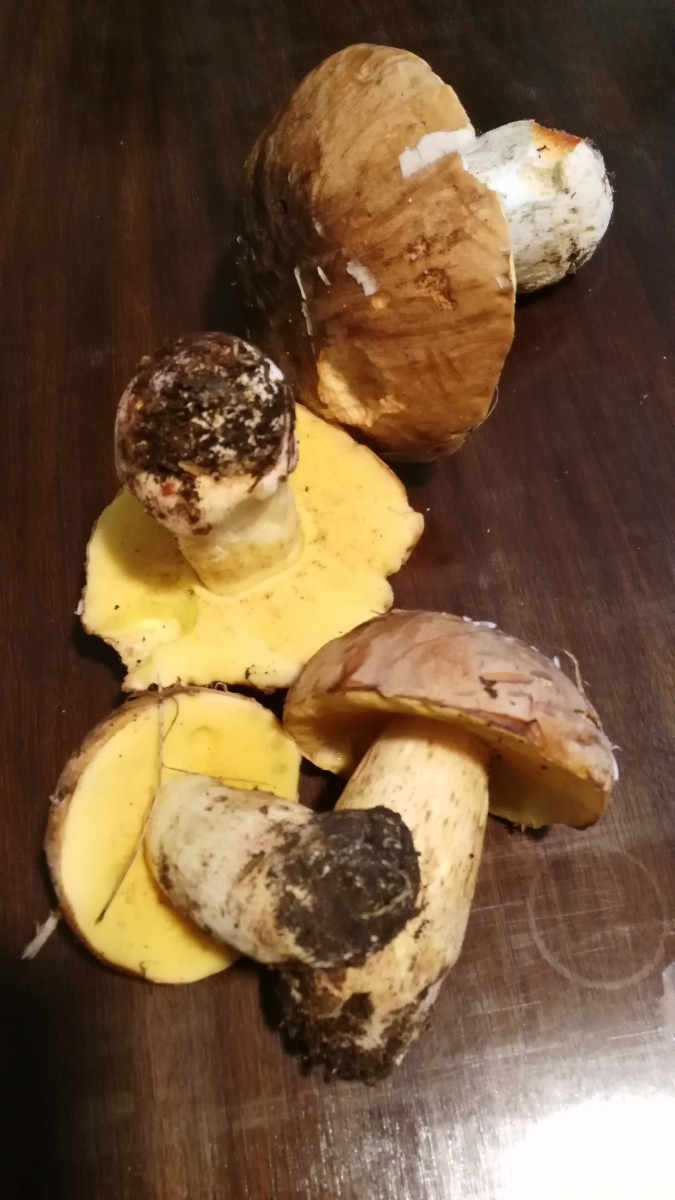 Das ist das A und O. Ebenso wie eine genaue Sicht auf die Stieloberfläche an der Stielspitze. So daß man auch die Netzzeichnungen (sofern vorhanden) sehen kann.Bringt also wenig an dieser Stelle zu spekulieren, auch wenn der mit dem weißen Stiel durchaus gut ein Steinpilz (Boletus edulis) sein könnte und die mit den gelben Stielen (die vermutlich eine feine Netzzeichnung haben und im Schnitt nicht blauen) sich als Boletus subappendiculatus (Falscher Anhängselröhrling) ganz wohl fühlen könnten.