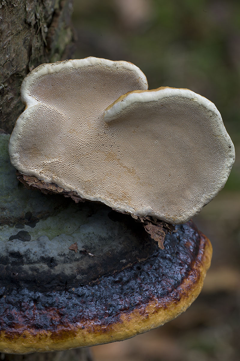 habe hier wieder zwei Baumpilze, die mir heute vor den Ansitz gewandert sind. Hinter dem Ersten vermute ich einen Fichten-Porling (Fomitopsis pinicola). Fundort-alter aber noch nicht total morscher Fichtenstamm. Beim Zweiten könnte ich mir den Angebrannten Rauchporling (Bjerkandera adusta) vorstellen. Fundort-vermutlich ein Buchen-oder Eichenstrunk, leider nicht mehr erkennbar. Liege ich mit meiner Bestimmung richtig?