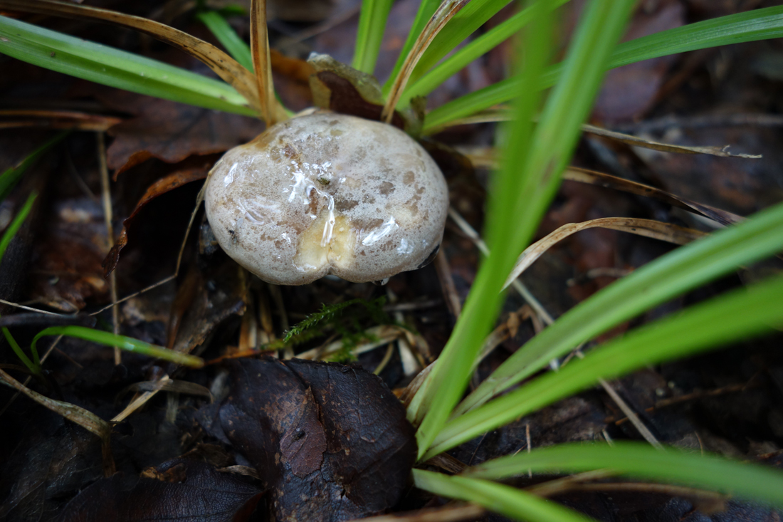 Ein kleiner Milchling stellte sich miutig in den Weg und wurde sogleich zur Bestimmung mitgenommen. Die Hut war ordentlich schleimig und die Milch färbte sich nach wenigen Minuten lila. Er wurde als Lactarius luridus uvidus bestimmt.