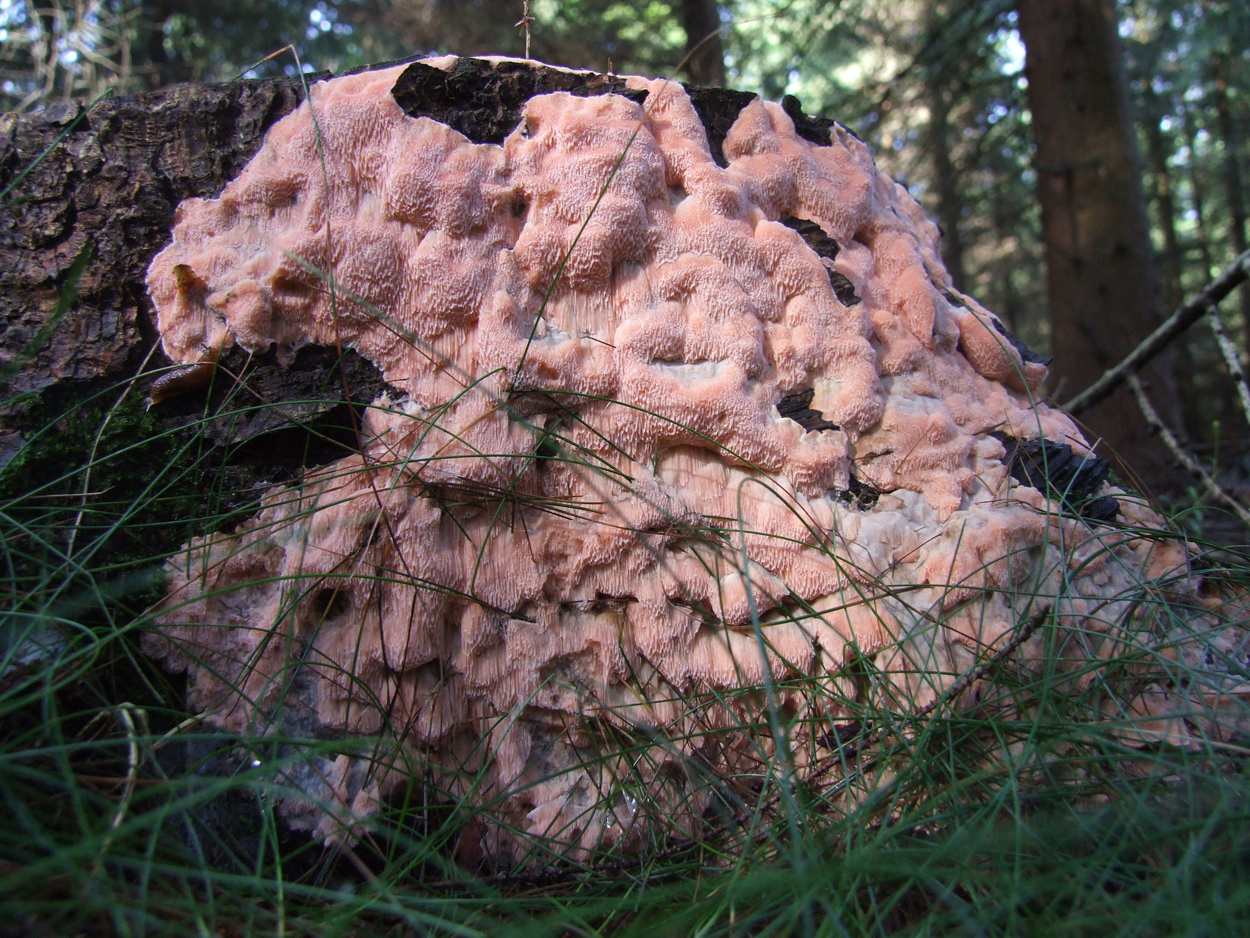 das ist interessant. Der letzte Fund eines rosafarbenen resupinaten Porlings an einem Konniferen-Stumpf(in dem Fall Picea) von mir hieß Regidoporus crocatus.