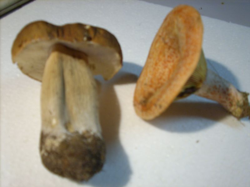 M. M. nach Boletus edulis. Und auch wie von dir vermutet ein Edelreizker (Lactarius deliciosus) . Auch die Farben kommen jetzt anders rüber, so dass die Ringzonierung, die Stielgrübchen und die Verletzung am Hut, die ins Grünliche geht, für den Edelreizker sprechen.