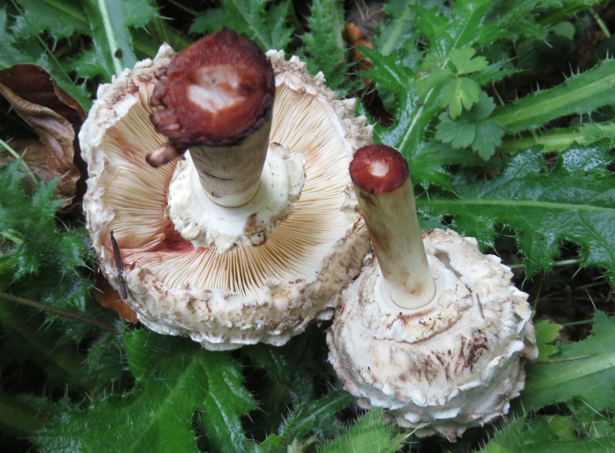 7) Meine ersten rötende Schirmlinge ohne Stielnatterung. Ist das der Gemeine Safranschirmling (Chlorophyllum rachodes)?