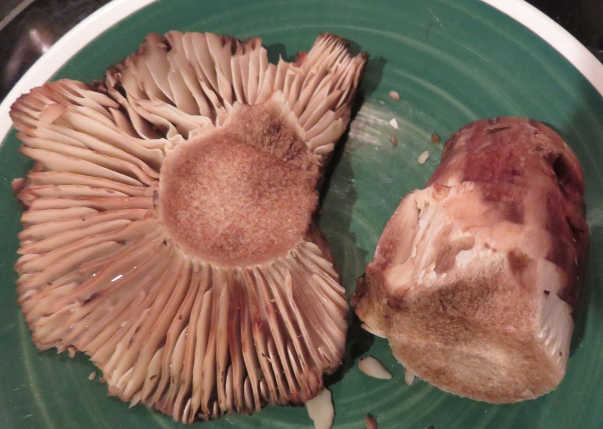 Die Verfärbung im Schnitt war zuerst Karroten-Orange, nach wenigen Minuten Weinrot, danach bräunlich. Passt zur Beschreibung von Safranschirmling.