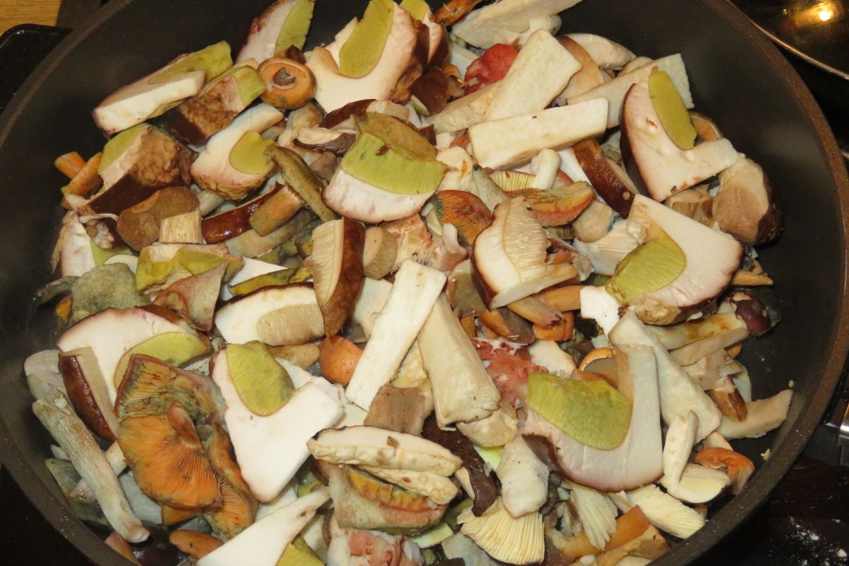 Am Ende gab es über ein Kilo Pilze für die bunte Pilzpfanne. Nur die Birkenreizker auf diesem Bild sind nicht in der Pfanne sondern erst mal in einem Eimerchen mit Wasser gelandet.