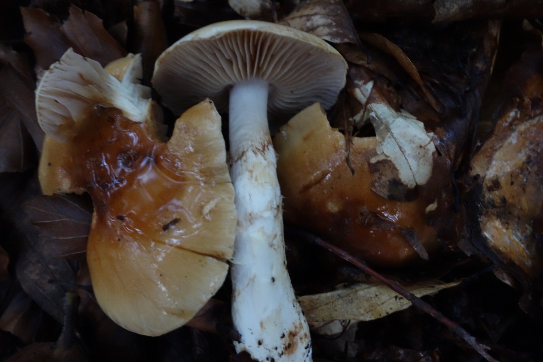 17) Bei diesem Pilz bin ich etwas ratlos. Spontaner Gedanke ist ein Schleimfuß, vielleicht sogar der Natternstielige. Der Stiel war aber trotz jungen Fruchtkörpers und feuchtem Wald nicht schleimig. Die Lamellen waren auffallend gräulich. Jetzt zweile ich sogar die Gattung Cortinarius an und lasse den Kollegen über Nacht aussporen.