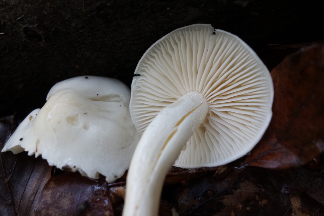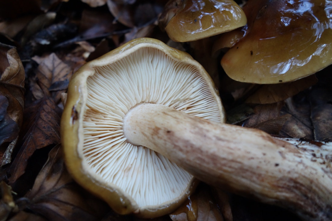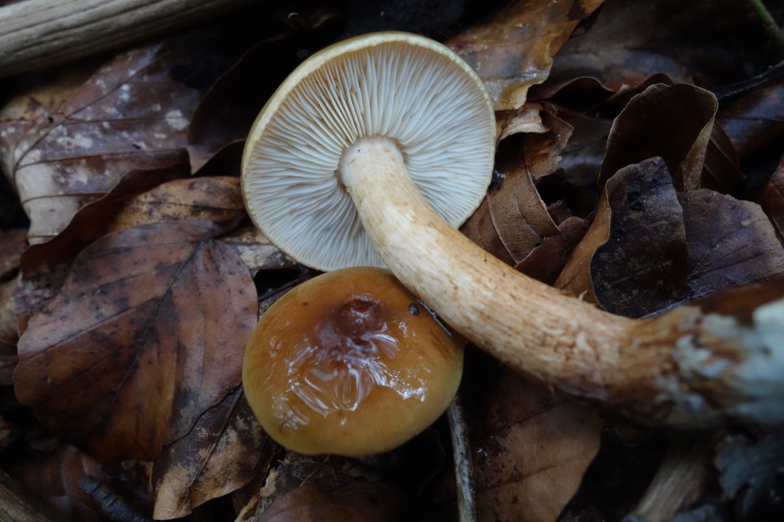 17) Bei diesem Pilz bin ich etwas ratlos. Spontaner Gedanke ist ein Schleimfuß, vielleicht sogar der Natternstielige. Der Stiel war aber trotz jungen Fruchtkörpers und feuchtem Wald nicht schleimig. Die Lamellen waren auffallend gräulich. Jetzt zweile ich sogar die Gattung Cortinarius an und lasse den Kollegen über Nacht aussporen.