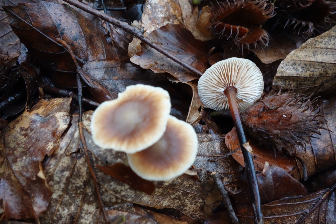 2) Diese kleinen Kerlchen standen unter den Buchen in Massen. Habitus und Stiel ließen mich gleich an einen Schwindling denken. Der Geruch war heftig nach Kohl. Ich tippe auf den Kohlstinkschwindling (Gymnopus brassicolens).