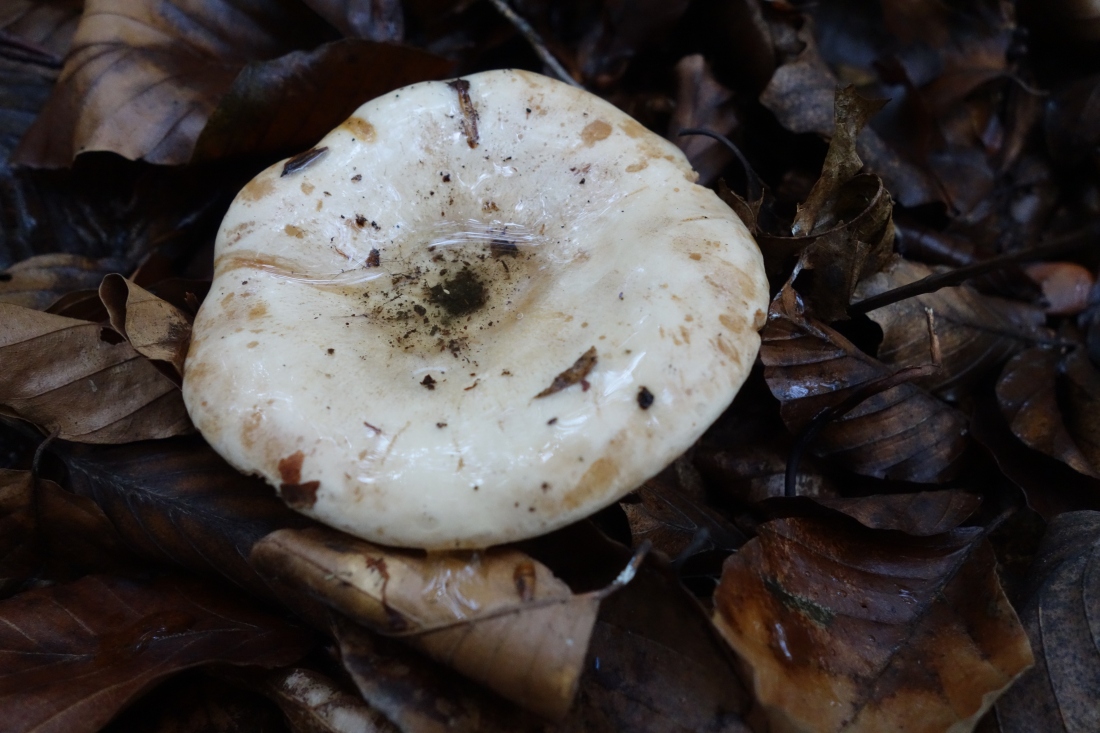 12) Dieser mir zunächst unbekannte Milchling fiel mir wegen seiner recht Blassen Farben auf. Die Milch war mild, ein Geruch kaum wahrnehmbar. Ich habe ihn (mittels Kibby) als Blassen Milchling (Lactarius Pallidus) geschlüsselt.