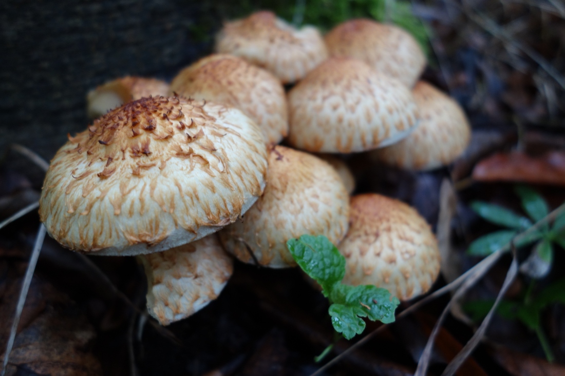 23) Ein paar alte mutmaßliche Sparrige Schüpplinge (Pholiota squarrosa) durften auch mit aufs Bild.