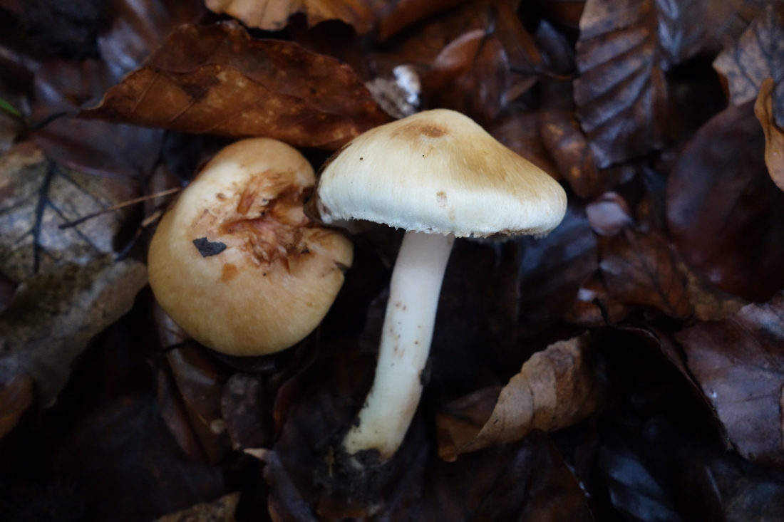 24) Bei diesen Kerlchen hatte ich zunächst keine Idee. Zu Hause war dann die Überraschung groß als ich daran gerochen habe: es war der gleiche widerliche pissige Geruch den ich erst einige Tage zuvor schon mal in der Nase hatte. Das Fleisch rötete im Schnitt leicht, etwas stärker in der Stielbasis. Ist es der Birnen-Risspilz (Innocybe pyriodora)? Den kenne ich aber mit deutlich zerupfterem Hut. Auch scheint es mehrere Risspilze mit einem ähnliche Geruch zu geben?