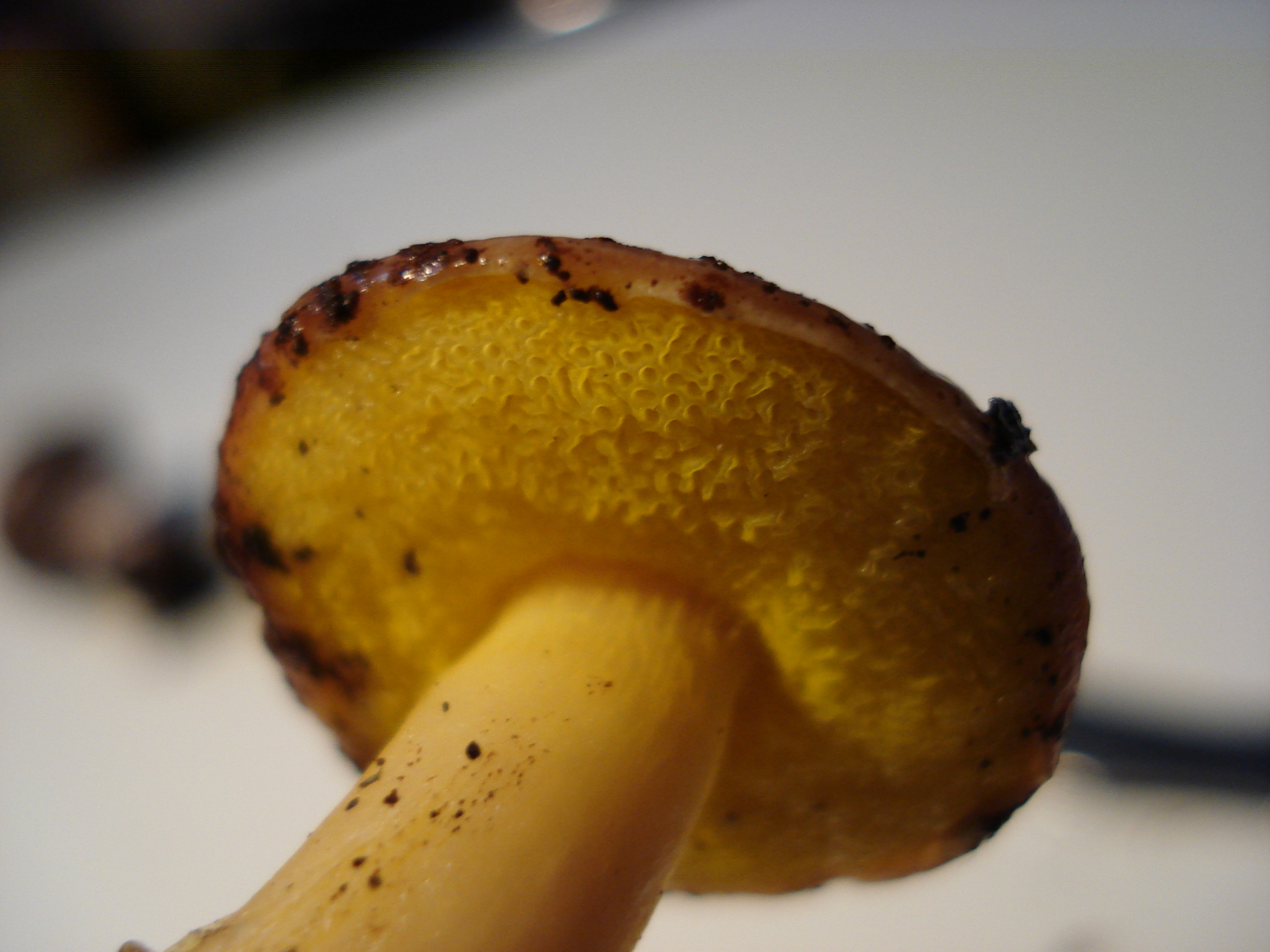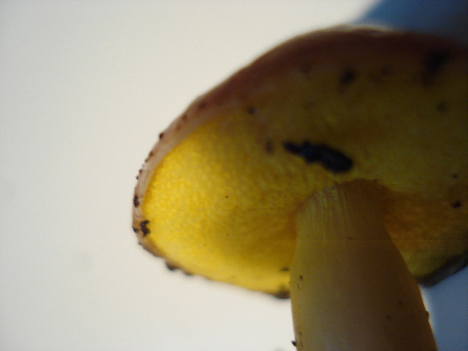 heute lief mir ein Röhrling über den Weg, den ich nicht kenne. Fundort Kalk-Buchenwald. Stand einzeln. Huthaut schmierig, Poren goldgelb (ähnlich Ziegenlippe), Stiel ebenfalls schmierig. Könnte das der Goldporige Röhrling sein oder doch etwas banales (Ringloser Butterpilz? aber weit und breit keine Kiefern)?