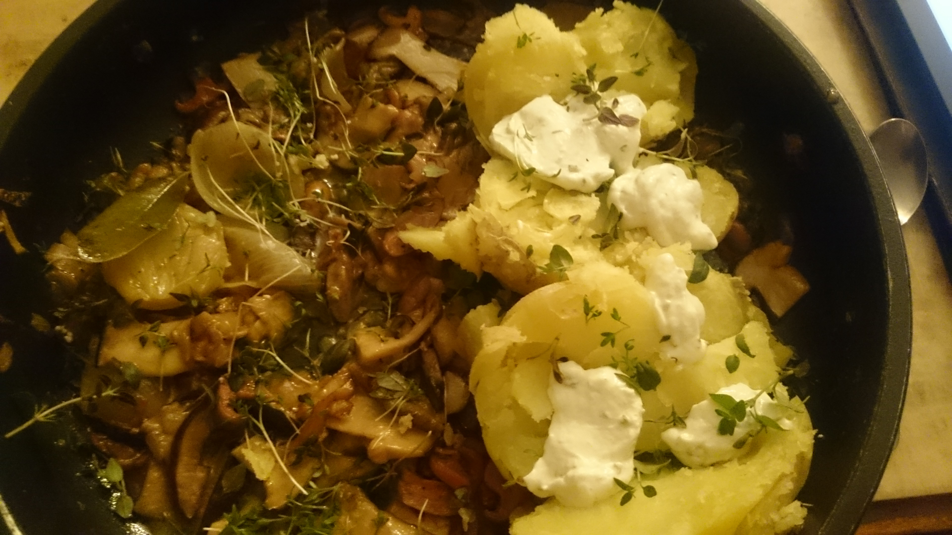 Dann mit den nebenbei gekochten Kartoffeln, die ich halb aufschneide, "füllen".