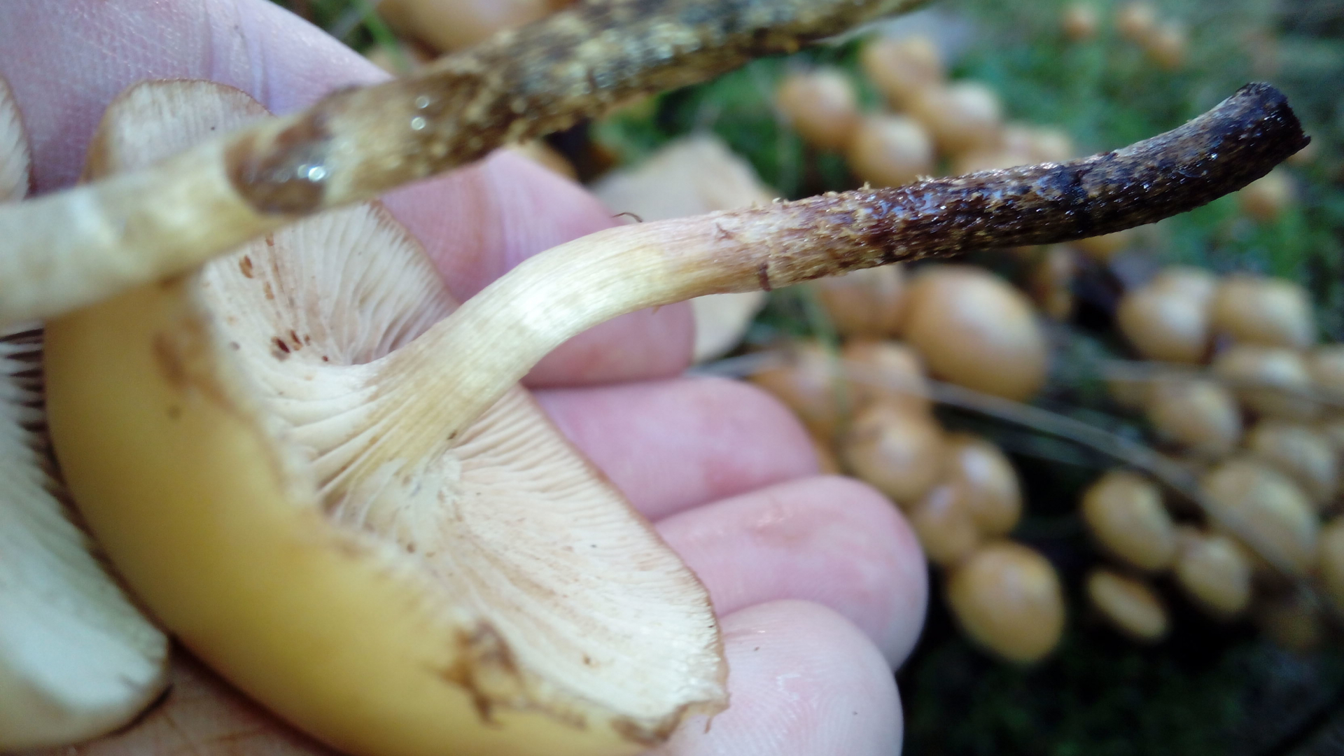 Was bissle schade ist durch den vorübergehend starken Regen, die Hutunterseite ist nicht unbedingt typisch für Stockschwämmchen. So "fleckig" findet man sie m. E. nach selten. Die Hutunterseite geht einfach nur von hell bis braun über im Lauf der Zeit, je nachdem wie stark die Fruchtkörper schon ausgesport haben.