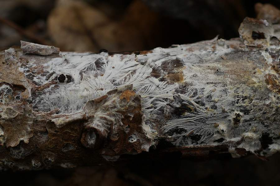 Er ist überwiegend reinweiß, jedoch an manchen Stellen gibt es einen gelblich-ockerlichen Beiton. Er wächst resupinat und äußerst dünn. Der Ast ist teils noch berindet, teils ist die Rinde schon ab oder in Ablösung befindlich. Der Pilz wächst unter der Rinde und auf ihr.