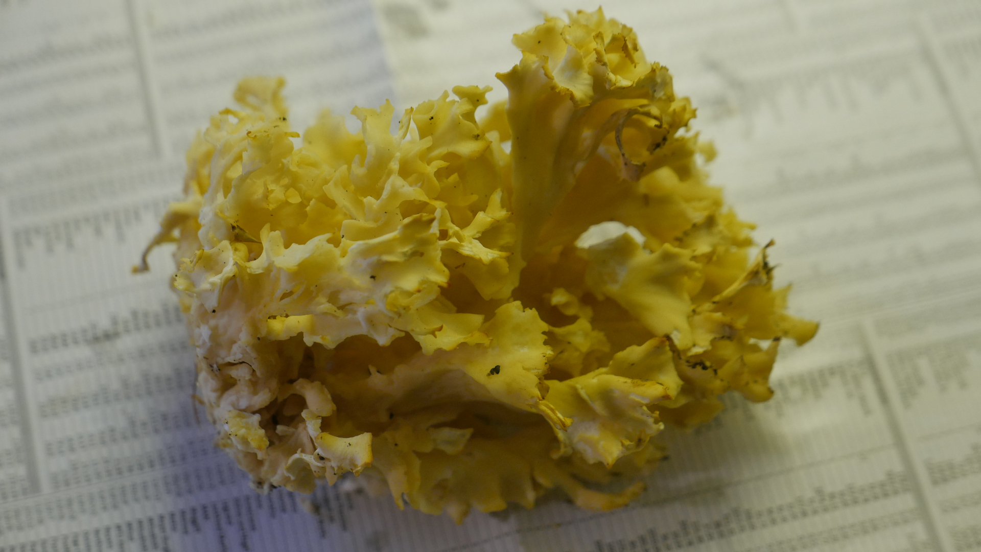 Pilz 2 war an einer Kiefer. Deswegen ging ich von einer krausen Glucke aus. Es war schon später Nachmittag und ziemlich dunkel im Wald. Ich habe erst Zuhause bei Licht erkannt, daß das wohl keine Glucke ist. Der Geruch ist anisartig (sagt meine Frau) für mich riecht er nur pilzig. Auf den ersten Blick sieht er aus wie ne Glucke aber die Lappen sind nicht so dicht aneinander, offener. Ich kanns gar nicht richtig beschreiben. Nur wenn eine Krause Glucke danebenliegt sehen die komplett unterschiedlich aus. Auch hier ist der Pilz nicht ganz so gelb wie auf den Fotos.