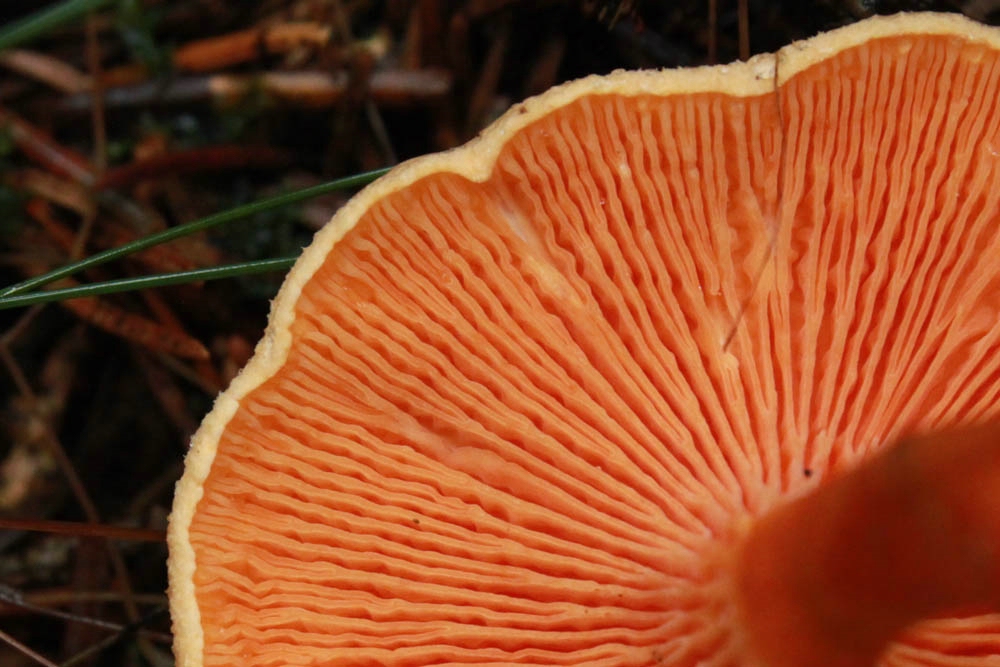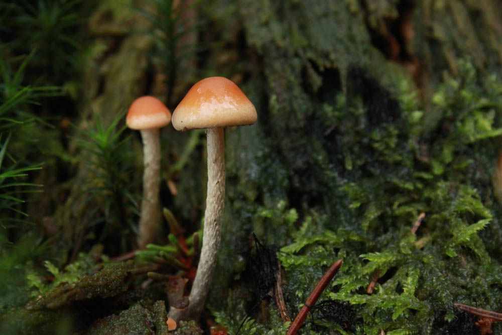 3a. Hat Spaß gemacht: Gelborangemilchender Helmling, Mycena crocata in großer Zahl: