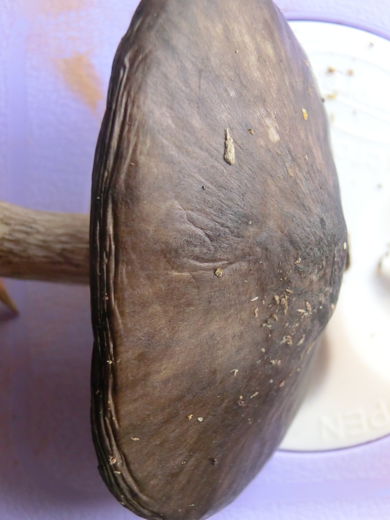 Dieser dürfte der rehbraune Dachpilz (Pluteus cervinus) sein. Ein Tag zuvor sah er noch richtig hübsch "saftig" aus und hatte weiße Lamellen. Da ich nicht gleich zum fotografieren kam, lag er eine Nacht auf einer Dose. Auf dieser hinterließ er auch seine Sporen.